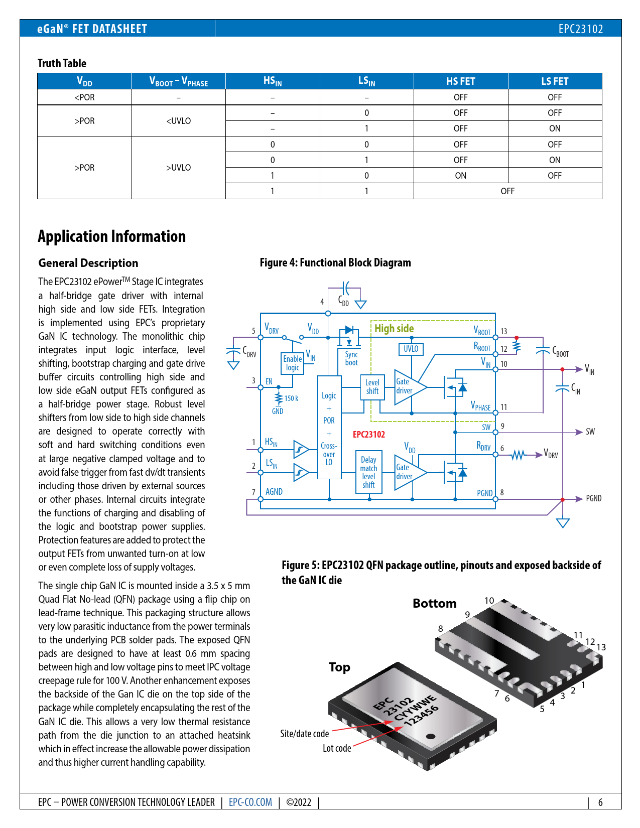 eGaN® FET DATASHEET. Truth Table. VDD. VBOOT – VPHASE. HSIN. LSIN. HS FET. LS FET. Application Information. General Description