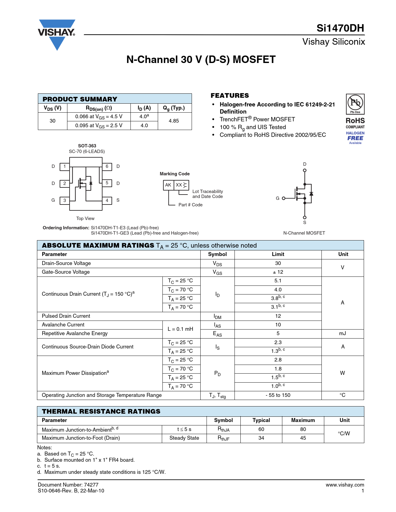 Si1470DH. N-Channel 30 V (D-S) MOSFET. FEATURES. PRODUCT SUMMARY. Halogen-free According to IEC 61249-2-21. VDS (V). RDS(on) (