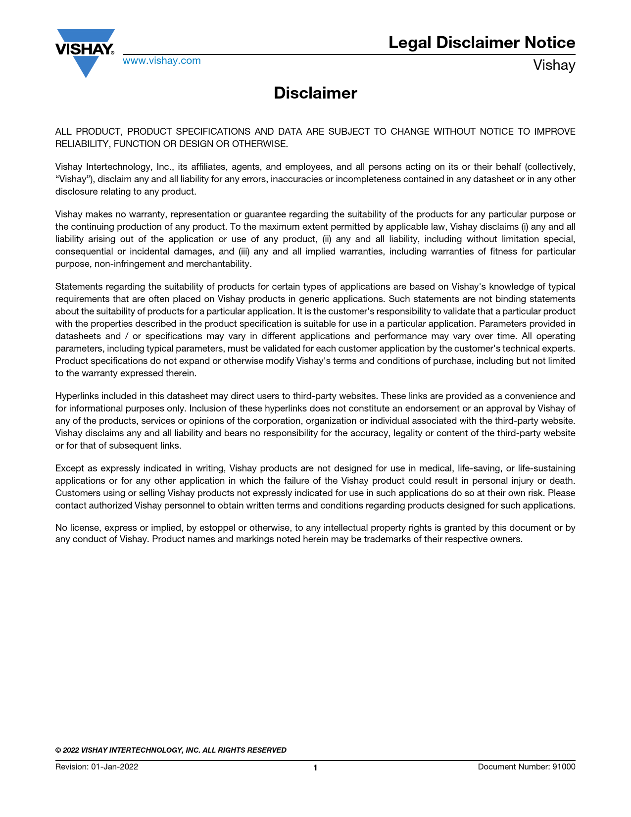 Legal Disclaimer Notice. Disclaimer. © 2022 VISHAY INTERTECHNOLOGY, INC. ALL RIGHTS RESERVED