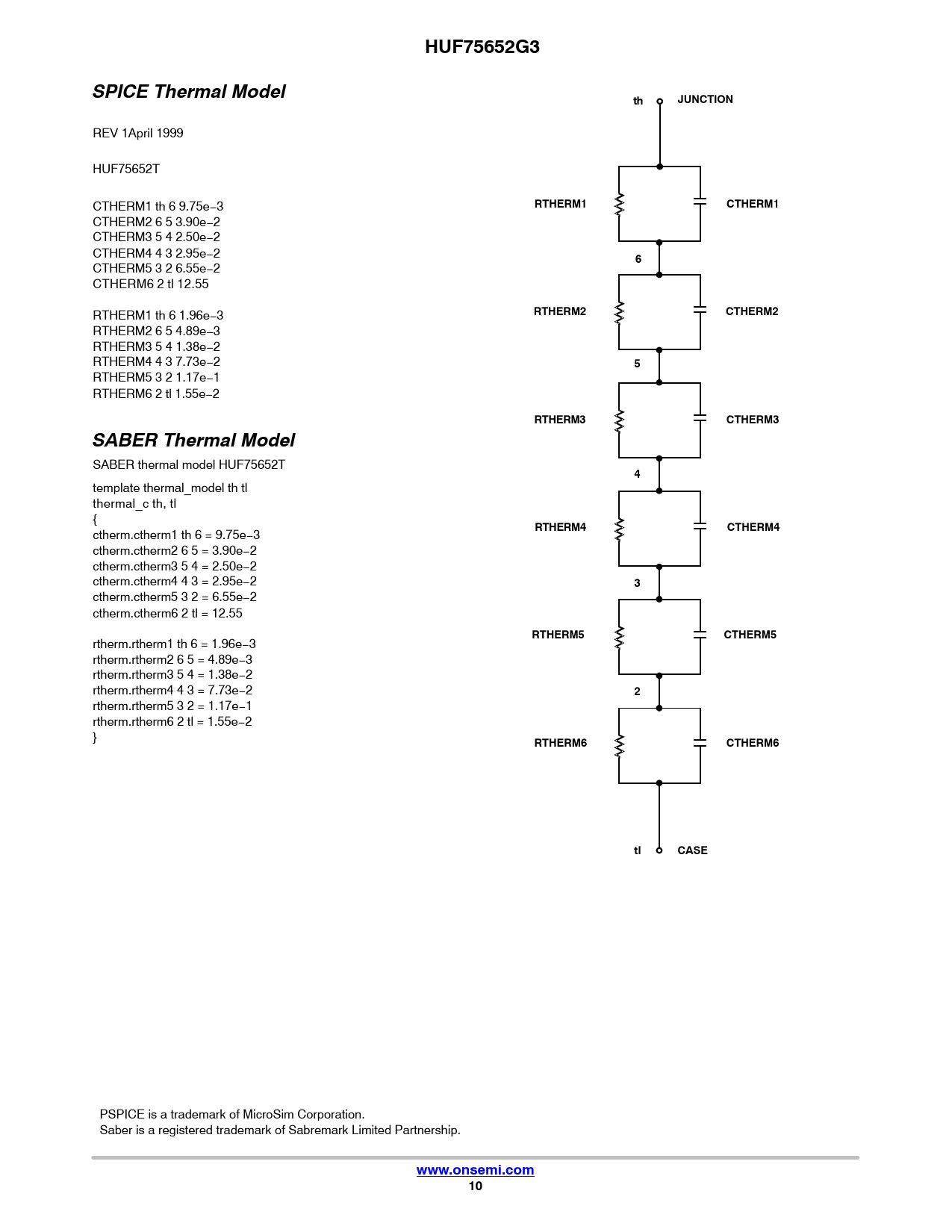 HUF75652G3. SPICE Thermal Model. JUNCTION. RTHERM1. CTHERM1. RTHERM2. CTHERM2. RTHERM3. CTHERM3. SABER Thermal Model. RTHERM4. CTHERM4. RTHERM5