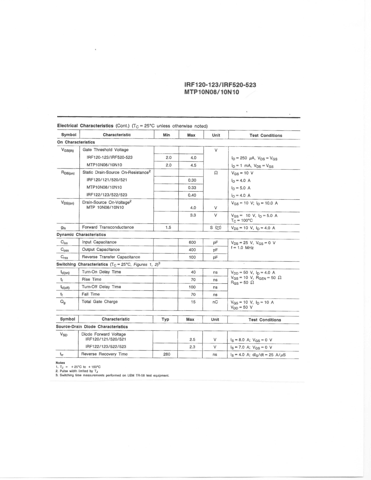 IRF120-123/IRF520-523. MTP10N08/10N10 Electrical Characteristics (Cont.) (Tc = 25°C unless otherwise noted)