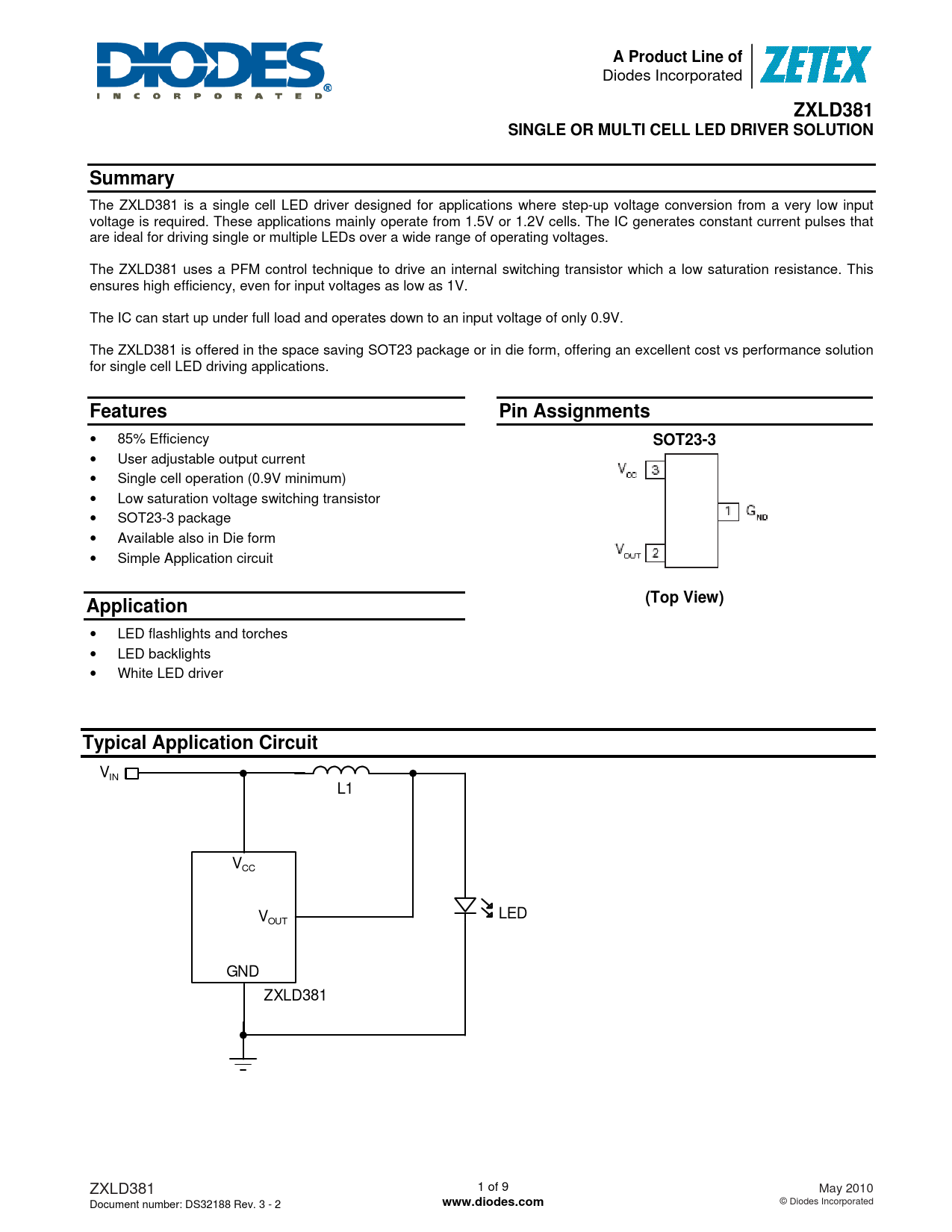 A Product Line of. ZXLD381. SINGLE OR MULTI CELL LED DRIVER SOLUTION. Summary. Features. Pin Assignments. SOT23-3. (Top View)