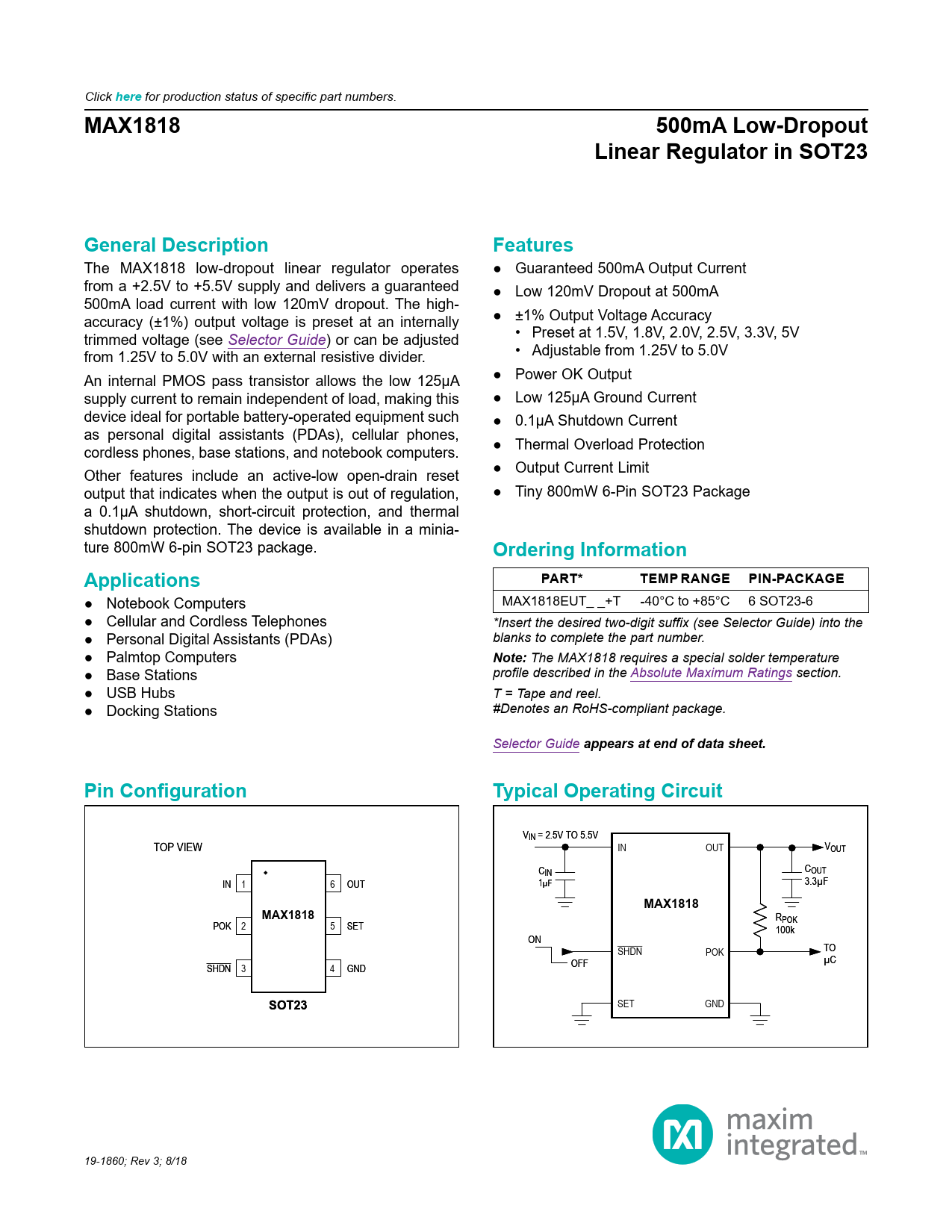 link to page 8 link to page 8 link to page 2 Click here for production status of specific part numbers. MAX1818500mA Low-DropoutLinear Regulator in SOT23General DescriptionFeatures The MAX1818 low-dropout linear regulator operates ● Guaranteed 500mA Output Current from a +2.5V to +5.5V supply and delivers a guaranteed ● Low 120mV Dropout at 500mA 500mA load current with low 120mV dropout. The high- accuracy (±1%) output voltage is preset at an internally ● ±1% Output Voltage Accuracy trimmed voltage (see Selector Guide) or can be adjusted • Preset at 1.5V, 1.8V, 2.0V, 2.5V, 3.3V, 5V from 1.25V to 5.0V with an external resistive divider. • Adjustable from 1.25V to 5.0V An internal PMOS pass transistor allows the low 125μA ● Power OK Output supply current to remain independent of load, making this ● Low 125μA Ground Current device ideal for portable battery-operated equipment such ● 0.1μA Shutdown Current as personal digital assistants (PDAs), cellular phones, cordless phones, base stations, and notebook computers. ● Thermal Overload Protection Other features include an active-low open-drain reset ● Output Current Limit output that indicates when the output is out of regulation, ● Tiny 800mW 6-Pin SOT23 Package a 0.1μA shutdown, short-circuit protection, and thermal shutdown protection. The device is available in a minia- ture 800mW 6-pin SOT23 package. Ordering InformationApplicationsPART*TEMP RANGE PIN-PACKAGE ● Notebook Computers MAX1818EUT_ _+T -40°C to +85°C 6 SOT23-6 ● Cellular and Cordless Telephones *Insert the desired two-digit suffix (see Selector Guide) into the ● Personal Digital Assistants (PDAs) blanks to complete the part number. ● Palmtop Computers Note: The MAX1818 requires a special solder temperature ● Base Stations profile described in the Absolute Maximum Ratings section. ● USB Hubs T = Tape and reel. ● Docking Stations #Denotes an RoHS-compliant package. Selector Guide appears at end of data sheet.Pin ConfigurationTypical Operating Circuit V IN V = IN 2. 2 5V 5 TO 5.5V 5 TOP VIEW NC IN OUT VOUT NC CIN C IN OUT C IN 1 6 OUT 1µF 3.3µF MAX1818MAX1818 R POK 2 5 SET POK 100k ON SHDN POK TO POK µC SHDN 3 4 GND OFF SOT23 SET GND 19-1860; Rev 3; 8/18