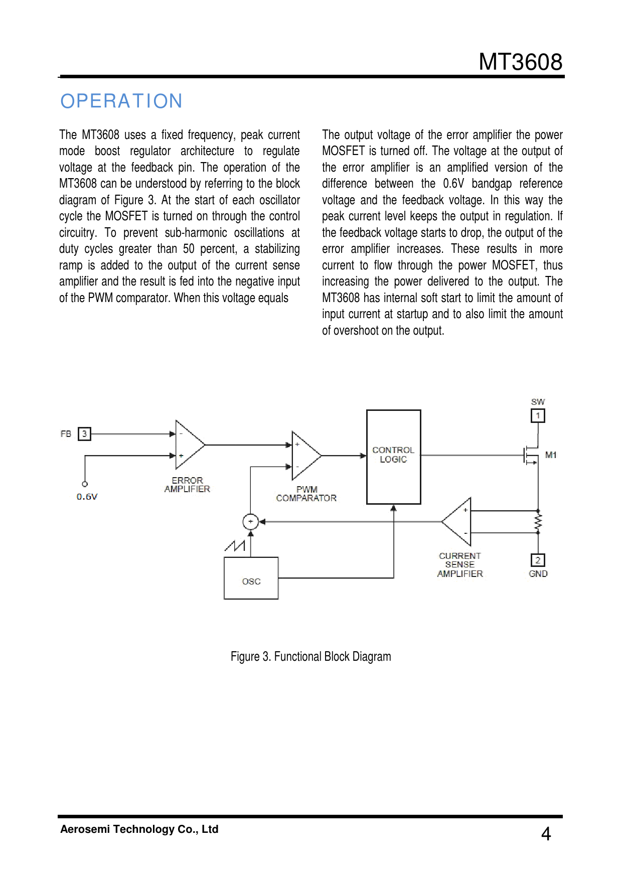 The MT3608 uses a fixed frequency, peak current The output voltage of the error amplifier the power mode boost regulator architecture to regulate MOSFET is turned off. The voltage at the output of voltage at the feedback pin. The operation of the the error amplifier is an amplified version of the MT3608 can be understood by referring to the block dif erence between the 0.6V bandgap reference diagram of Figure 3. At the start of each oscil ator voltage and the feedback voltage. In this way the cycle the MOSFET is turned on through the control peak current level keeps the output in regulation. If circuitry. To prevent sub-harmonic oscil ations at the feedback voltage starts to drop, the output of the duty cycles greater than 50 percent, a stabilizing error amplifier increases. These results in more ramp is added to the output of the current sense current to flow through the power MOSFET, thus amplifier and the result is fed into the negative input increasing the power delivered to the output. The of the PWM comparator. When this voltage equals MT3608 has internal soft start to limit the amount of input current at startup and to also limit the amount of overshoot on the output. Figure 3. Functional Block Diagram