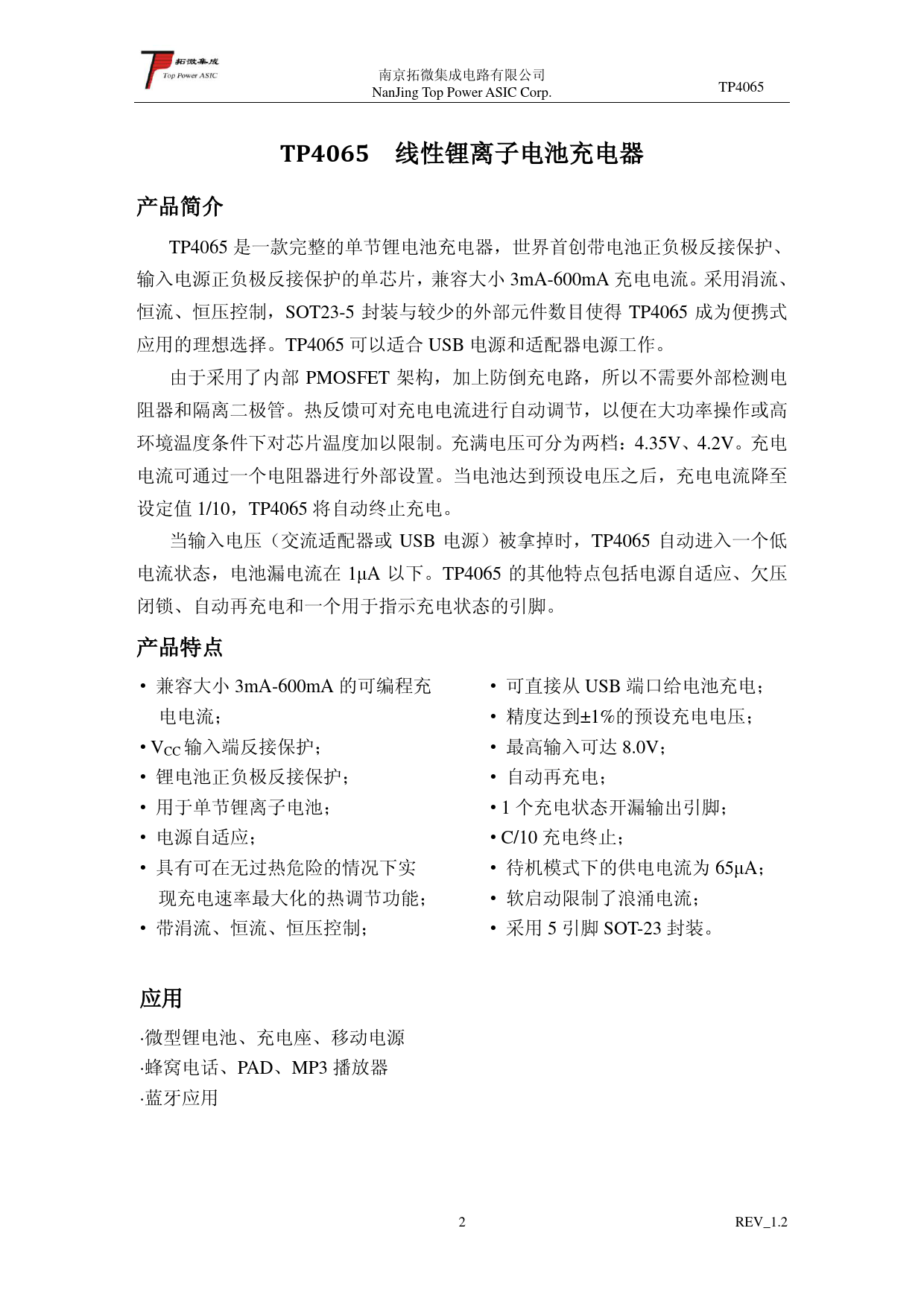 南京拓微集成电路有限公司 NanJing Top Power ASIC Corp. TP4065