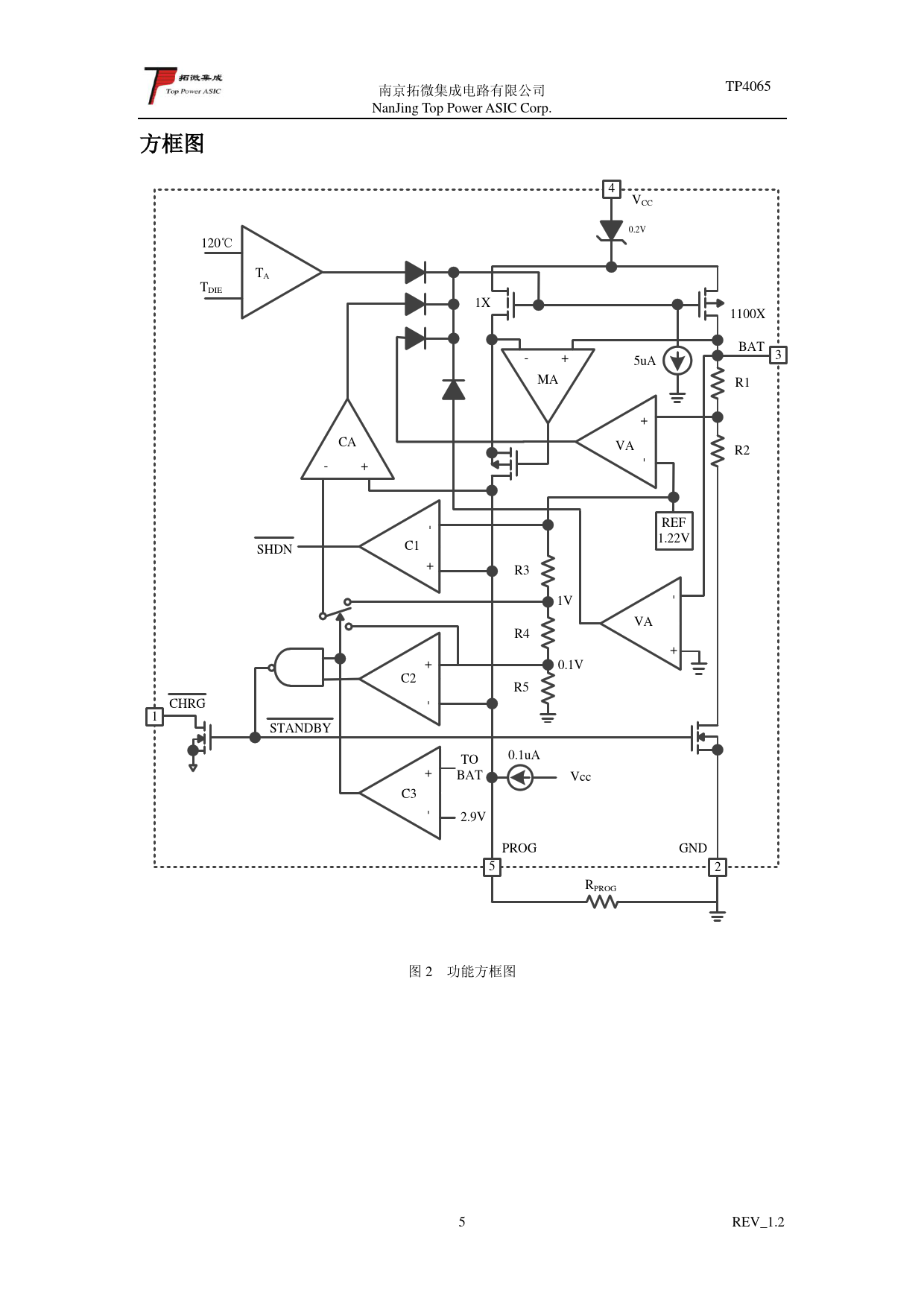 南京拓微集成电路有限公司 TP4065 NanJing Top Power ASIC Corp. 方框图 4 VCC 0.2V 120℃ TA TDIE 1X 1100X BAT - + 3 5uA MA R1 CA VA R2 - + - + - REF 1.22V C1 SHDN + R3 1V - VA R4 + 0.1V C2 R5 CHRG - + 1 STANDBY 0.1uA TO BAT Vcc C3 - + 2.9V PROG GND 5 2 RPROG 图 2 功能方框图 5 REV_1.2