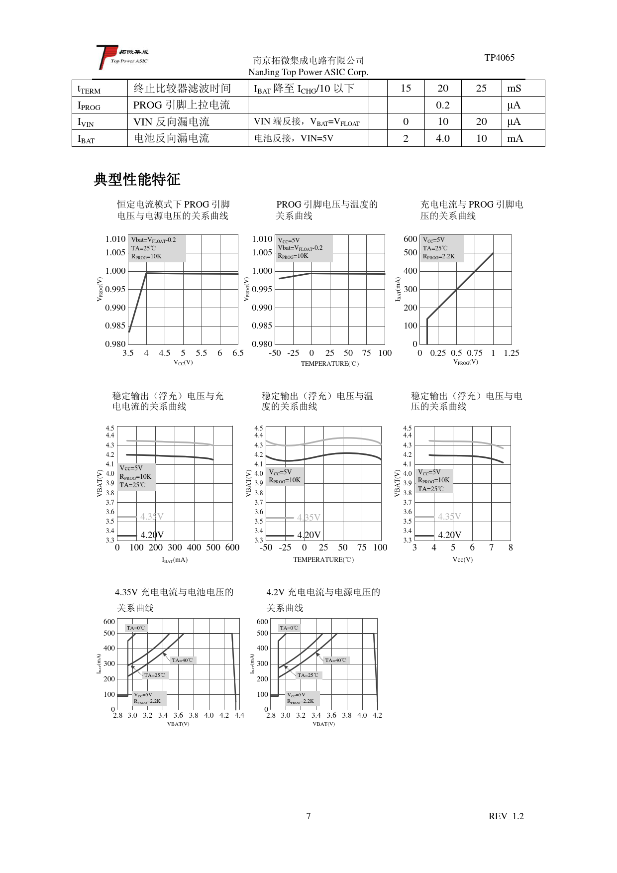 南京拓微集成电路有限公司. TP4065. NanJing. Top. Power. ASIC. Corp. t. 降至. TERM. 终止比较器滤波时间. IBAT. ICHG/10. 以下. 15. 20. 25. mS. IPROG. PROG. 引脚上拉电流. 0.2. μA. IVIN. VIN. 反向漏电流. VIN