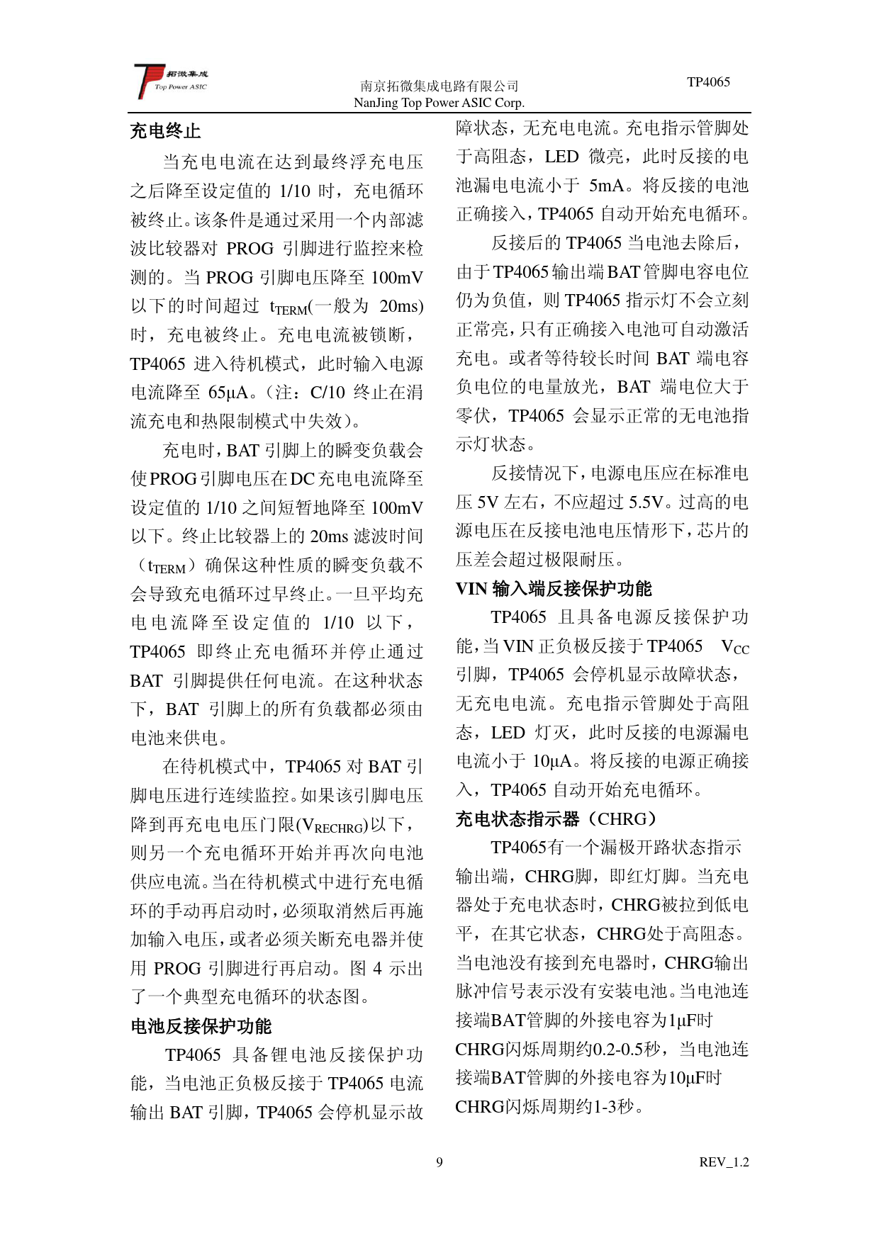 输入端反接保护功能 电 电 流 降 至 设 定 值 的 1/10 以 下 , TP4065 且具备电源 反接保护功 TP4065 即终止充电循环并停止通过 能, 当 VIN 正负极反接于 TP4065 VCC 引脚, BAT 引脚提供任何电流。在这种状态 TP4065 会停机显示故障状态, 下,BAT 引脚上的所有负载都必须由 无充电电流。充电指示管脚处于高阻 电池来供电。 态, LED 灯灭,此时反接的电源漏电 在待机模式中,TP4065 对 BAT 引 电流小于 10μA。将反接的电源正确接 脚电压进行连续监控。如果该引脚电压 入,TP4065 自动开始充电循环。 降到再充电电压门限(V 充电状态指示器(CHRG) RECHRG)以下, 则另一个充电循环开始并再次向电池 TP4065有一个漏极开路状态指示 供应电流。当在待机模式中进行充电循 输出端,CHRG脚,即红灯脚。当充电 环的手动再启动时,必须取消然后再施 器处于充电状态时,CHRG被拉到低电 加输入电压,或者必须关断充电器并使 平,在其它状态,CHRG处于高阻态。 用 当电池没有接到充电器时, PROG 引脚进行再启动。图 4 示出 CHRG输出 了一个典型充电循环的状态图。 脉冲信号表示没有安装电池。当电池连 电池反接保护功能 接端 BAT管脚的外接电容为1μF时 TP4065 具备 锂电池 反接保护功 CHRG闪烁周期约0.2-0.5秒,当电池连 能,当电池正负极反接于 接端 TP4065 电流 BAT管脚的外接电容为10μF时 输出 BAT 引脚,TP4065 会停机显示故 CHRG闪烁周期约1-3秒。 9 REV_1.2
