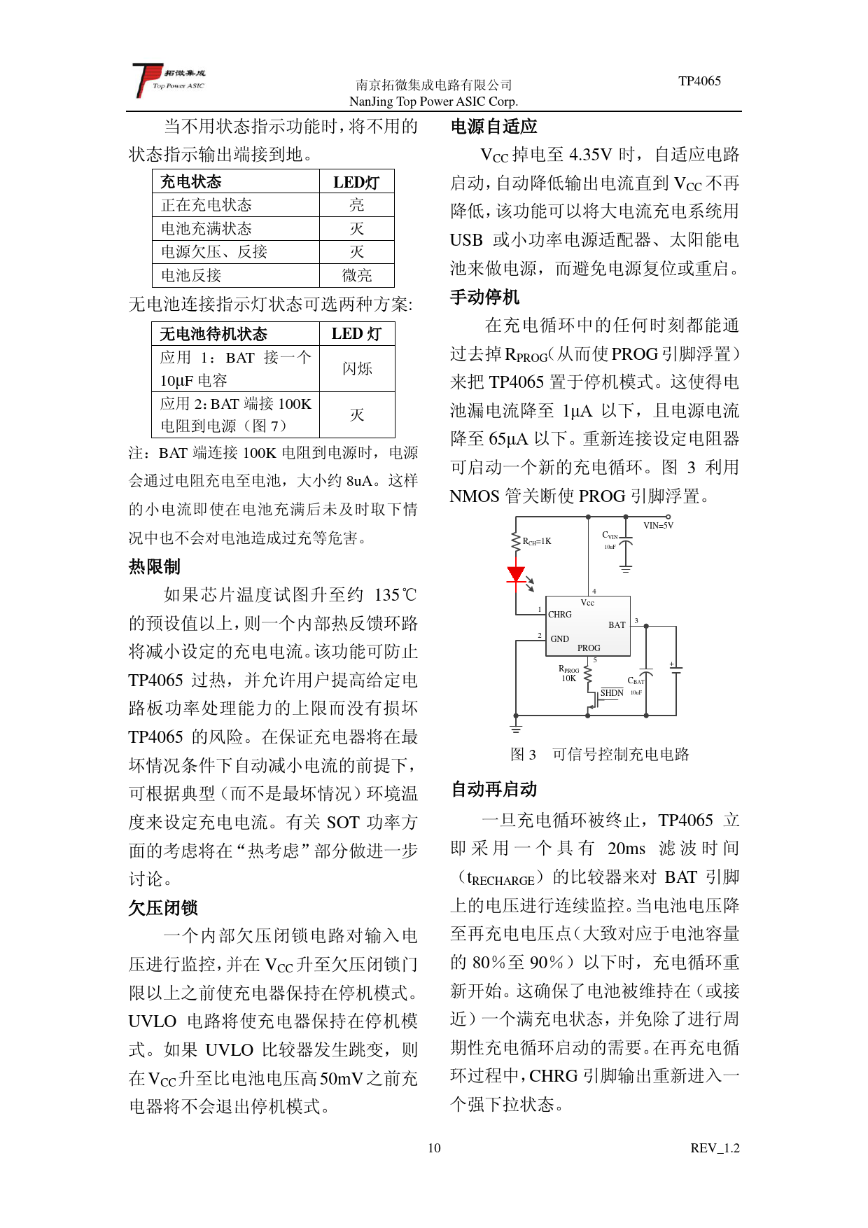 南京拓微集成电路有限公司 TP4065 NanJing Top Power ASIC Corp. 当不用状态指示功能时,将不用的 电源自适应 状态指示输出端接到地。 V 掉电至 CC 4.35V 时,自适应电路 充电状态