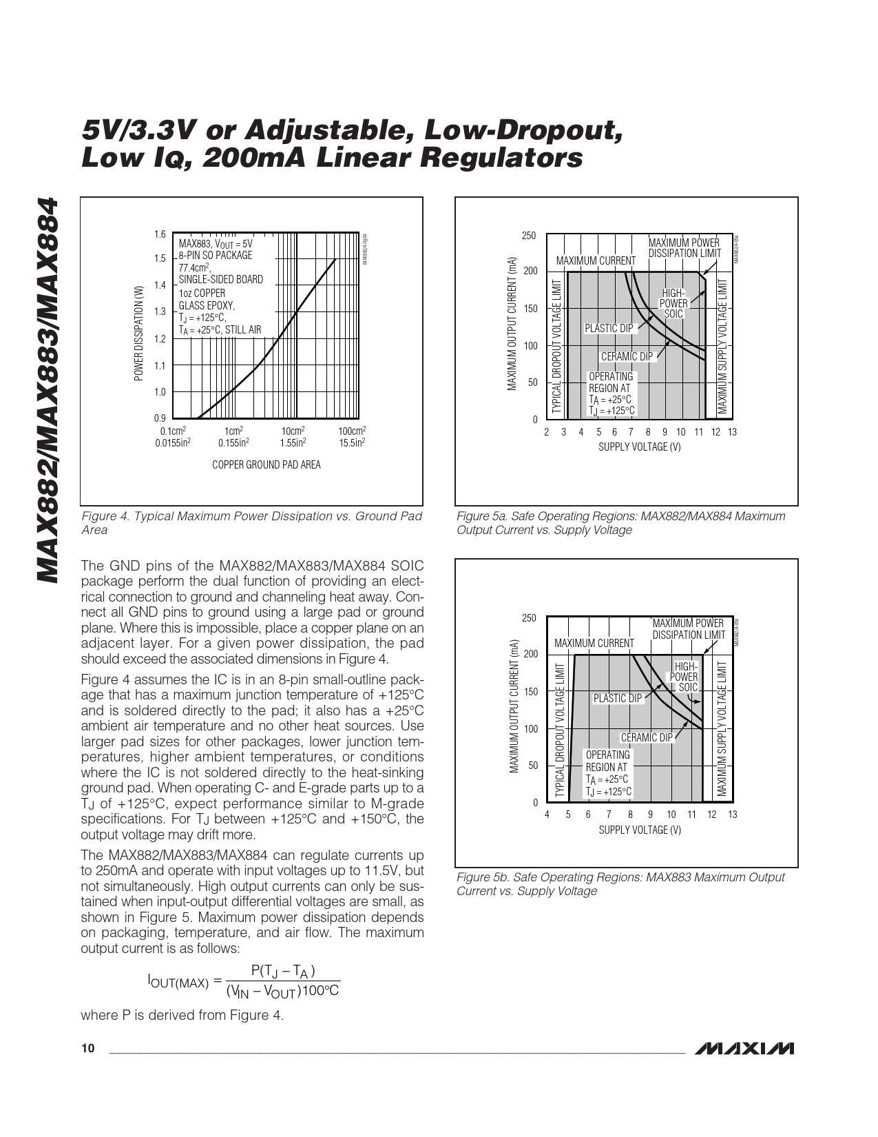 The GND pins of the MAX882/MAX883/MAX884 SOIC package perform the dual function of providing an elect- rical connection to ground and channeling heat away. Con- nect all GND pins to ground using a large pad or ground 250 plane. Where this is impossible, place a copper plane on an MAXIMUM POWER DISSIPATION LIMIT adjacent layer. For a given power dissipation, the pad MAXIMUM CURRENT MAX882/4-05b should exceed the associated dimensions in Figure 4. 200 HIGH- Figure 4 assumes the IC is in an 8-pin small-outline pack- POWER SOIC age that has a maximum junction temperature of +125°C 150 PLASTIC DIP and is soldered directly to the pad; it also has a +25°C ambient air temperature and no other heat sources. Use 100 larger pad sizes for other packages, lower junction tem- CERAMIC DIP peratures, higher ambient temperatures, or conditions OPERATING 50 where the IC is not soldered directly to the heat-sinking MAXIMUM OUTPUT CURRENT (mA) REGION AT TA = +25°C ground pad. When operating C- and E-grade parts up to a TYPICAL DROPOUT VOLTAGE LIMIT TJ = +125°C MAXIMUM SUPPLY VOLTAGE LIMIT TJ of +125°C, expect performance similar to M-grade 0 specifications. For T 4 5 6 7 8 9 10 11 12 13 J between +125°C and +150°C, the output voltage may drift more. SUPPLY VOLTAGE (V) The MAX882/MAX883/MAX884 can regulate currents up to 250mA and operate with input voltages up to 11.5V, but Figure 5b. Safe Operating Regions: MAX883 Maximum Output not simultaneously. High output currents can only be sus- Current vs. Supply Voltage tained when input-output differential voltages are small, as shown in Figure 5. Maximum power dissipation depends on packaging, temperature, and air flow. The maximum output current is as follows: P(T − T ) I J A OUT(MAX) = (V − V )100 C IN OUT ° where P is derived from Figure 4.