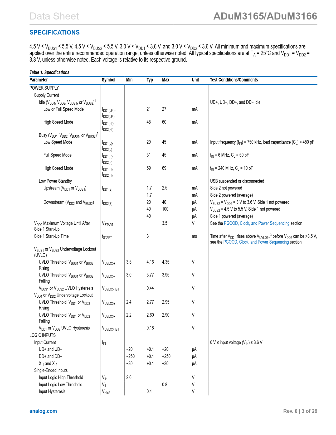 ADuM3165/ADuM3166. SPECIFICATIONS. Table 1. Specifications. Parameter. Symbol. Min. Typ. Max. Unit. Test Conditions/Comments. analog.com
