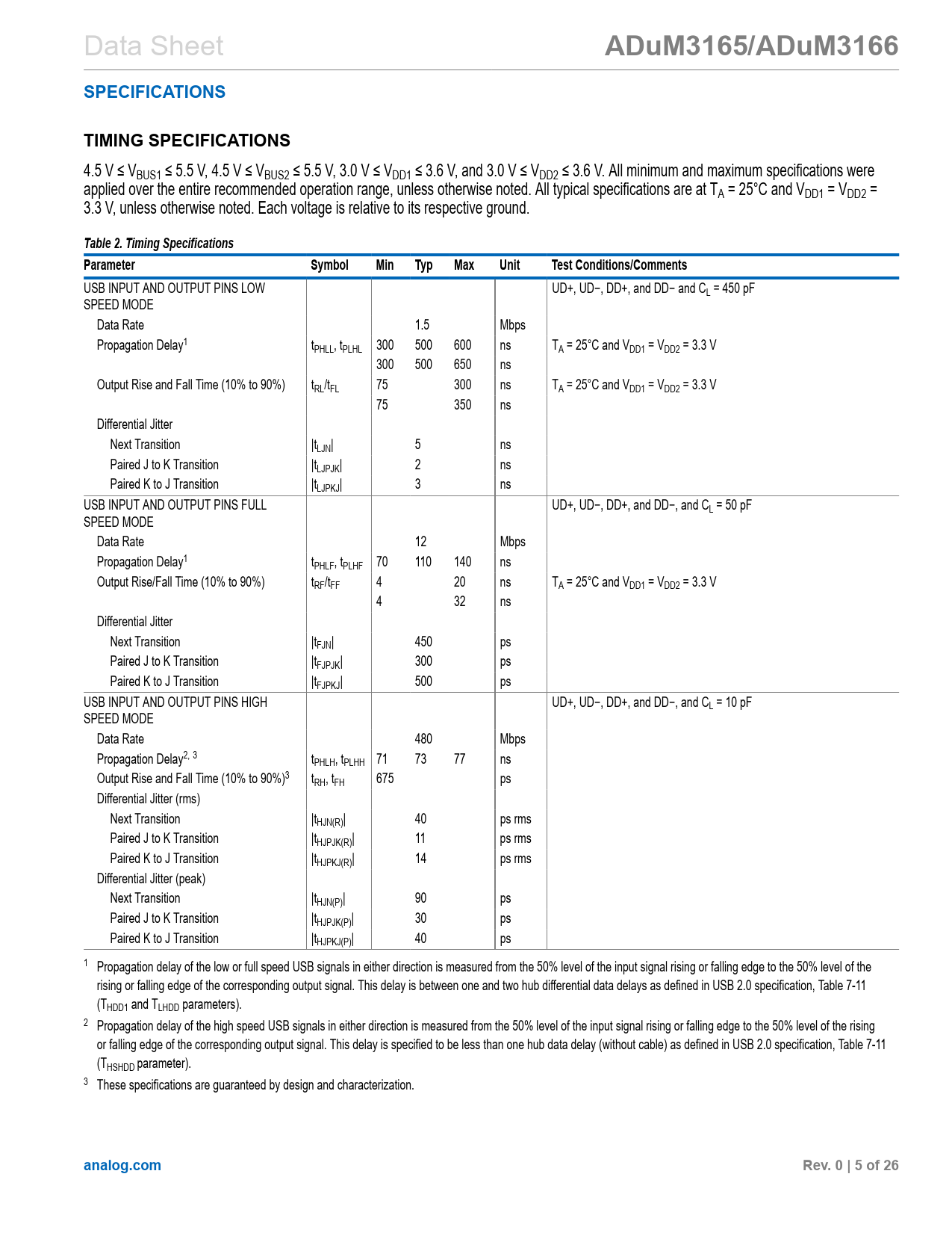 link to page 5 link to page 5 link to page 5 link to page 5 link to page 5 Data Sheet ADuM3165/ADuM3166SPECIFICATIONSTIMING SPECIFICATIONS 4.5 V ≤ VBUS1 ≤ 5.5 V, 4.5 V ≤ VBUS2 ≤ 5.5 V, 3.0 V ≤ VDD1 ≤ 3.6 V, and 3.0 V ≤ VDD2 ≤ 3.6 V. All minimum and maximum specifications were applied over the entire recommended operation range, unless otherwise noted. All typical specifications are at TA = 25°C and VDD1 = VDD2 = 3.3 V, unless otherwise noted. Each voltage is relative to its respective ground. Table 2. Timing SpecificationsParameterSymbolMinTypMaxUnitTest Conditions/Comments USB INPUT AND OUTPUT PINS LOW UD+, UD−, DD+, and DD− and CL = 450 pF SPEED MODE Data Rate 1.5 Mbps Propagation Delay1 tPHLL, tPLHL 300 500 600 ns TA = 25°C and VDD1 = VDD2 = 3.3 V 300 500 650 ns Output Rise and Fall Time (10% to 90%) tRL/tFL 75 300 ns TA = 25°C and VDD1 = VDD2 = 3.3 V 75 350 ns Differential Jitter Next Transition |tLJN| 5 ns Paired J to K Transition |tLJPJK| 2 ns Paired K to J Transition |tLJPKJ| 3 ns USB INPUT AND OUTPUT PINS FULL UD+, UD−, DD+, and DD−, and CL = 50 pF SPEED MODE Data Rate 12 Mbps Propagation Delay1 tPHLF, tPLHF 70 110 140 ns Output Rise/Fall Time (10% to 90%) tRF/tFF 4 20 ns TA = 25°C and VDD1 = VDD2 = 3.3 V 4 32 ns Differential Jitter Next Transition |tFJN| 450 ps Paired J to K Transition |tFJPJK| 300 ps Paired K to J Transition |tFJPKJ| 500 ps USB INPUT AND OUTPUT PINS HIGH UD+, UD−, DD+, and DD−, and CL = 10 pF SPEED MODE Data Rate 480 Mbps Propagation Delay2, 3 tPHLH, tPLHH 71 73 77 ns Output Rise and Fall Time (10% to 90%)3 tRH, tFH 675 ps Differential Jitter (rms) Next Transition |tHJN(R)| 40 ps rms Paired J to K Transition |tHJPJK(R)| 11 ps rms Paired K to J Transition |tHJPKJ(R)| 14 ps rms Differential Jitter (peak) Next Transition |tHJN(P)| 90 ps Paired J to K Transition |tHJPJK(P)| 30 ps Paired K to J Transition |tHJPKJ(P)| 40 ps 1 Propagation delay of the low or full speed USB signals in either direction is measured from the 50% level of the input signal rising or falling edge to the 50% level of the rising or falling edge of the corresponding output signal. This delay is between one and two hub differential data delays as defined in USB 2.0 specification, Table 7-11 (THDD1 and TLHDD parameters). 2 Propagation delay of the high speed USB signals in either direction is measured from the 50% level of the input signal rising or falling edge to the 50% level of the rising or falling edge of the corresponding output signal. This delay is specified to be less than one hub data delay (without cable) as defined in USB 2.0 specification, Table 7-11 (THSHDD parameter). 3 These specifications are guaranteed by design and characterization. analog.comRev. 0 | 5 of 26 Document Outline Features Applications Functional Block Diagrams General Description Specifications Timing Specifications Insulation and Safety Related Specifications Package Characteristics Regulatory Information DIN V VDE V 0884-11 (VDE V 0884-11) Insulation Characteristics (Pending) Recommended Operating Conditions Absolute Maximum Ratings Thermal Resistance Electrostatic Discharge (ESD) Ratings ESD Ratings for ADuM3165/ADuM3166 ESD Caution Pin Configurations and Function Descriptions Truth Tables Typical Performance Characteristics Terminology Bus Upstream and Downstream Hub Host Peripheral Enumeration Low Speed Full Speed High Speed End of Packet (EOP) J State K State SE0 State SE1 State Idle L1 Suspend L2 Suspend Theory of Operation Automatic Data Transfer and Modes Retimer and Other Features Isolator Characteristics and Low Power Modes Applications Information Power Supply Options Clock Options PGOOD, Clock, and Power Sequencing Isolated USB Implementations Peripheral Applications Host Applications Interface Applications PCB Layout and Electromagnetic Interference (EMI) Insulation Lifetime Surface Tracking Insulation Wear Out Calculation and Use of Parameters Example Outline Dimensions Ordering Guide Evaluation Boards