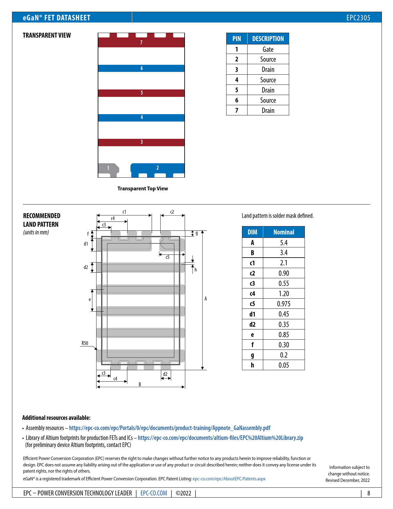 eGaN® FET DATASHEET. TRANSPARENT VIEW. PIN. DESCRIPTION. Transparent Top View. RECOMMENDED. LAND PATTERN. DIM. Nominal