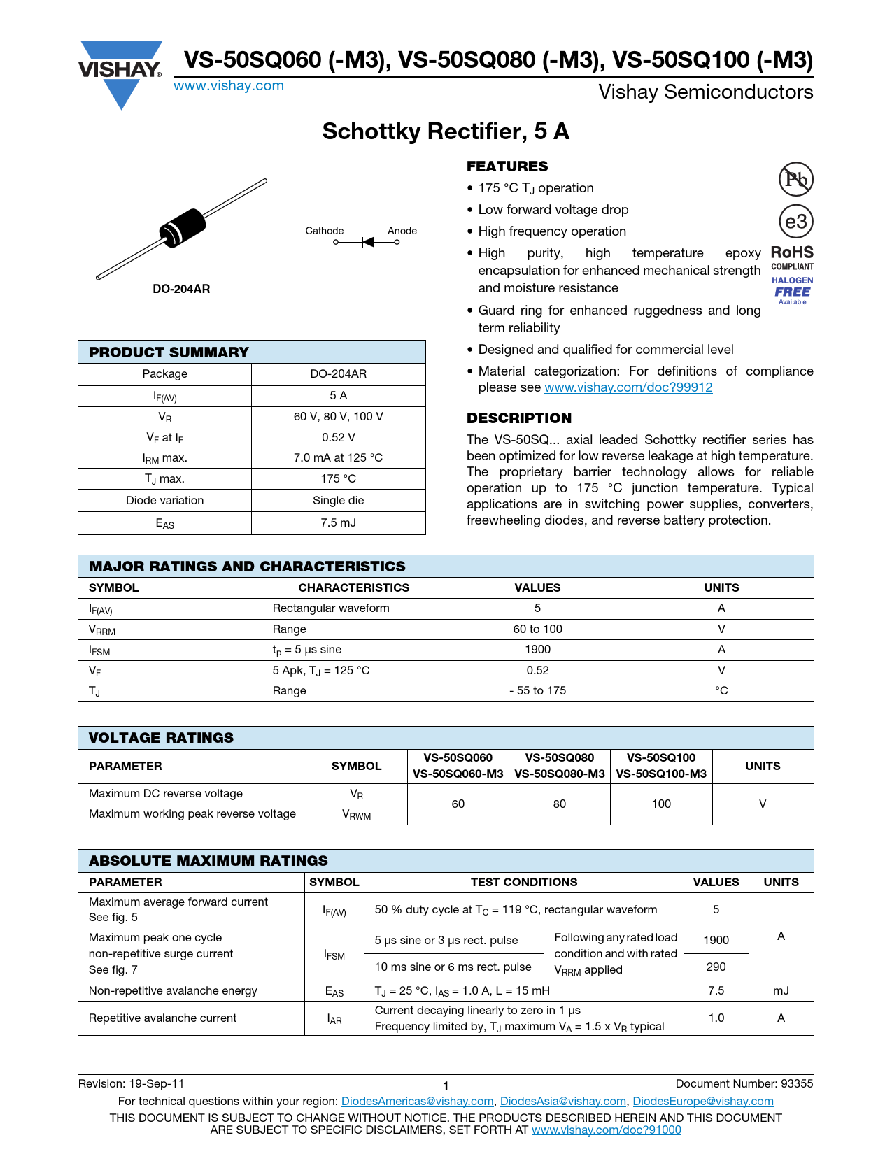 VS-50SQ060 (-M3), VS-50SQ080 (-M3), VS-50SQ100 (-M3). Schottky Rectifier, 5 A. FEATURES. DO-204AR. PRODUCT SUMMARY. DESCRIPTION