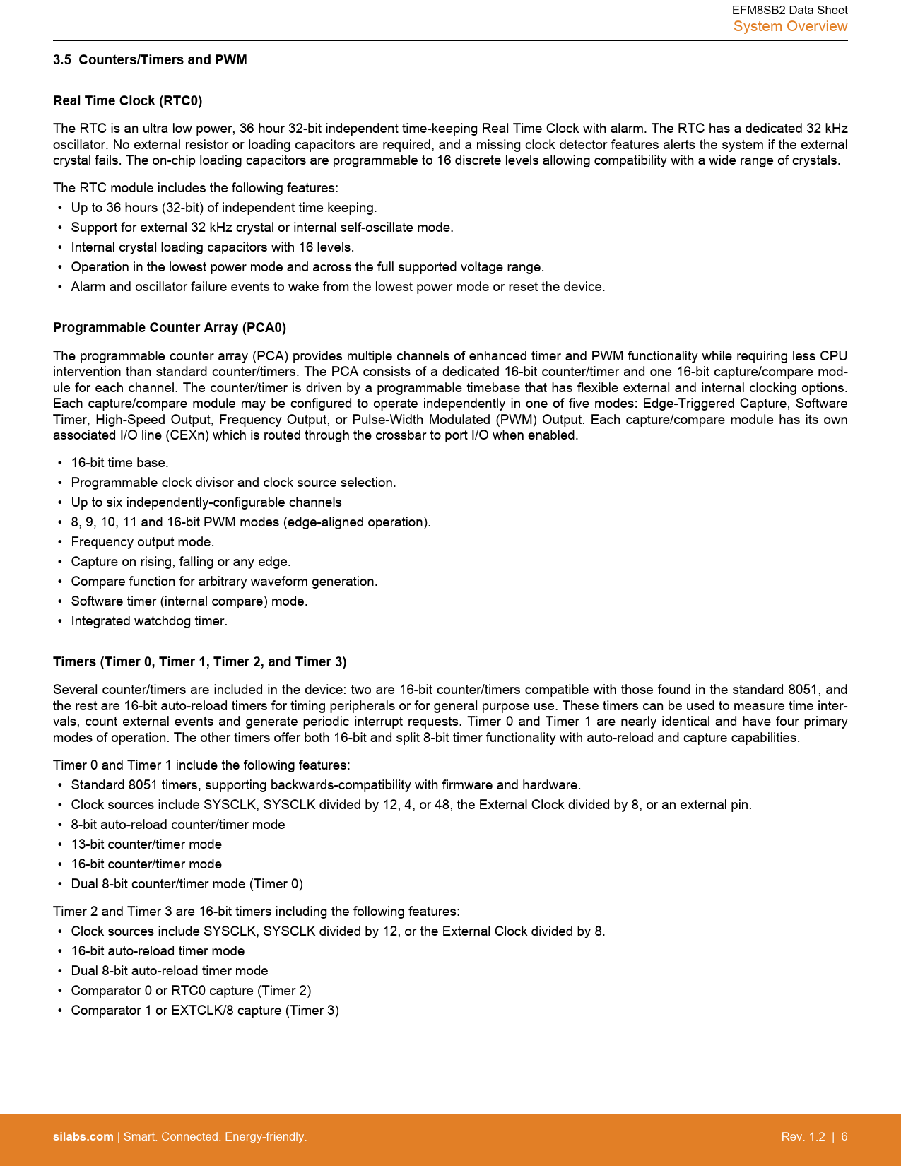 EFM8SB2 Data Sheet System Overview 3.5 Counters/Timers and PWMReal Time Clock (RTC0) The RTC is an ultra low power, 36 hour 32-bit independent time-keeping Real Time Clock with alarm. The RTC has a dedicated 32 kHz oscillator. No external resistor or loading capacitors are required, and a missing clock detector features alerts the system if the external crystal fails. The on-chip loading capacitors are programmable to 16 discrete levels allowing compatibility with a wide range of crystals. The RTC module includes the following features: • Up to 36 hours (32-bit) of independent time keeping. • Support for external 32 kHz crystal or internal self-oscillate mode. • Internal crystal loading capacitors with 16 levels. • Operation in the lowest power mode and across the full supported voltage range. • Alarm and oscillator failure events to wake from the lowest power mode or reset the device. Programmable Counter Array (PCA0) The programmable counter array (PCA) provides multiple channels of enhanced timer and PWM functionality while requiring less CPU intervention than standard counter/timers. The PCA consists of a dedicated 16-bit counter/timer and one 16-bit capture/compare mod- ule for each channel. The counter/timer is driven by a programmable timebase that has flexible external and internal clocking options. Each capture/compare module may be configured to operate independently in one of five modes: Edge-Triggered Capture, Software Timer, High-Speed Output, Frequency Output, or Pulse-Width Modulated (PWM) Output. Each capture/compare module has its own associated I/O line (CEXn) which is routed through the crossbar to port I/O when enabled. • 16-bit time base. • Programmable clock divisor and clock source selection. • Up to six independently-configurable channels • 8, 9, 10, 11 and 16-bit PWM modes (edge-aligned operation). • Frequency output mode. • Capture on rising, falling or any edge. • Compare function for arbitrary waveform generation. • Software timer (internal compare) mode. • Integrated watchdog timer. Timers (Timer 0, Timer 1, Timer 2, and Timer 3) Several counter/timers are included in the device: two are 16-bit counter/timers compatible with those found in the standard 8051, and the rest are 16-bit auto-reload timers for timing peripherals or for general purpose use. These timers can be used to measure time inter- vals, count external events and generate periodic interrupt requests. Timer 0 and Timer 1 are nearly identical and have four primary modes of operation. The other timers offer both 16-bit and split 8-bit timer functionality with auto-reload and capture capabilities. Timer 0 and Timer 1 include the following features: • Standard 8051 timers, supporting backwards-compatibility with firmware and hardware. • Clock sources include SYSCLK, SYSCLK divided by 12, 4, or 48, the External Clock divided by 8, or an external pin. • 8-bit auto-reload counter/timer mode • 13-bit counter/timer mode • 16-bit counter/timer mode • Dual 8-bit counter/timer mode (Timer 0) Timer 2 and Timer 3 are 16-bit timers including the following features: • Clock sources include SYSCLK, SYSCLK divided by 12, or the External Clock divided by 8. • 16-bit auto-reload timer mode • Dual 8-bit auto-reload timer mode • Comparator 0 or RTC0 capture (Timer 2) • Comparator 1 or EXTCLK/8 capture (Timer 3) silabs.com | Smart. Connected. Energy-friendly. Rev. 1.2 | 6 Document Outline 1. Feature List 2. Ordering Information 3. System Overview 3.1 Introduction 3.2 Power 3.3 I/O 3.4 Clocking 3.5 Counters/Timers and PWM 3.6 Communications and Other Digital Peripherals 3.7 Analog 3.8 Reset Sources 3.9 Debugging 3.10 Bootloader 4. Electrical Specifications 4.1 Electrical Characteristics 4.1.1 Recommended Operating Conditions 4.1.2 Power Consumption 4.1.3 Reset and Supply Monitor 4.1.4 Flash Memory 4.1.5 Power Management Timing 4.1.6 Internal Oscillators 4.1.7 Crystal Oscillator 4.1.8 External Clock Input 4.1.9 ADC 4.1.10 Voltage References 4.1.11 Temperature Sensor 4.1.12 Comparators 4.1.13 Programmable Current Reference (IREF0) 4.1.14 Port I/O 4.2 Thermal Conditions 4.3 Absolute Maximum Ratings 4.4 Typical Performance Curves 5. Typical Connection Diagrams 5.1 Power 5.2 Debug 5.3 Other Connections 6. Pin Definitions 6.1 EFM8SB2x-QFN32 Pin Definitions 6.2 EFM8SB2x-QFN24 Pin Definitions 6.3 EFM8SB2x-QFP32 Pin Definitions 7. QFN32 Package Specifications 7.1 QFN32 Package Dimensions 7.2 QFN32 PCB Land Pattern 7.3 QFN32 Package Marking 8. QFN24 Package Specifications 8.1 QFN24 Package Dimensions 8.2 QFN24 PCB Land Pattern 8.3 QFN24 Package Marking 9. QFP32 Package Specifications 9.1 QFP32 Package Dimensions 9.2 QFP32 PCB Land Pattern 9.3 QFP32 Package Marking 10. Revision History 10.1 Revision 1.2 10.2 Revision 1.1 Table of Contents