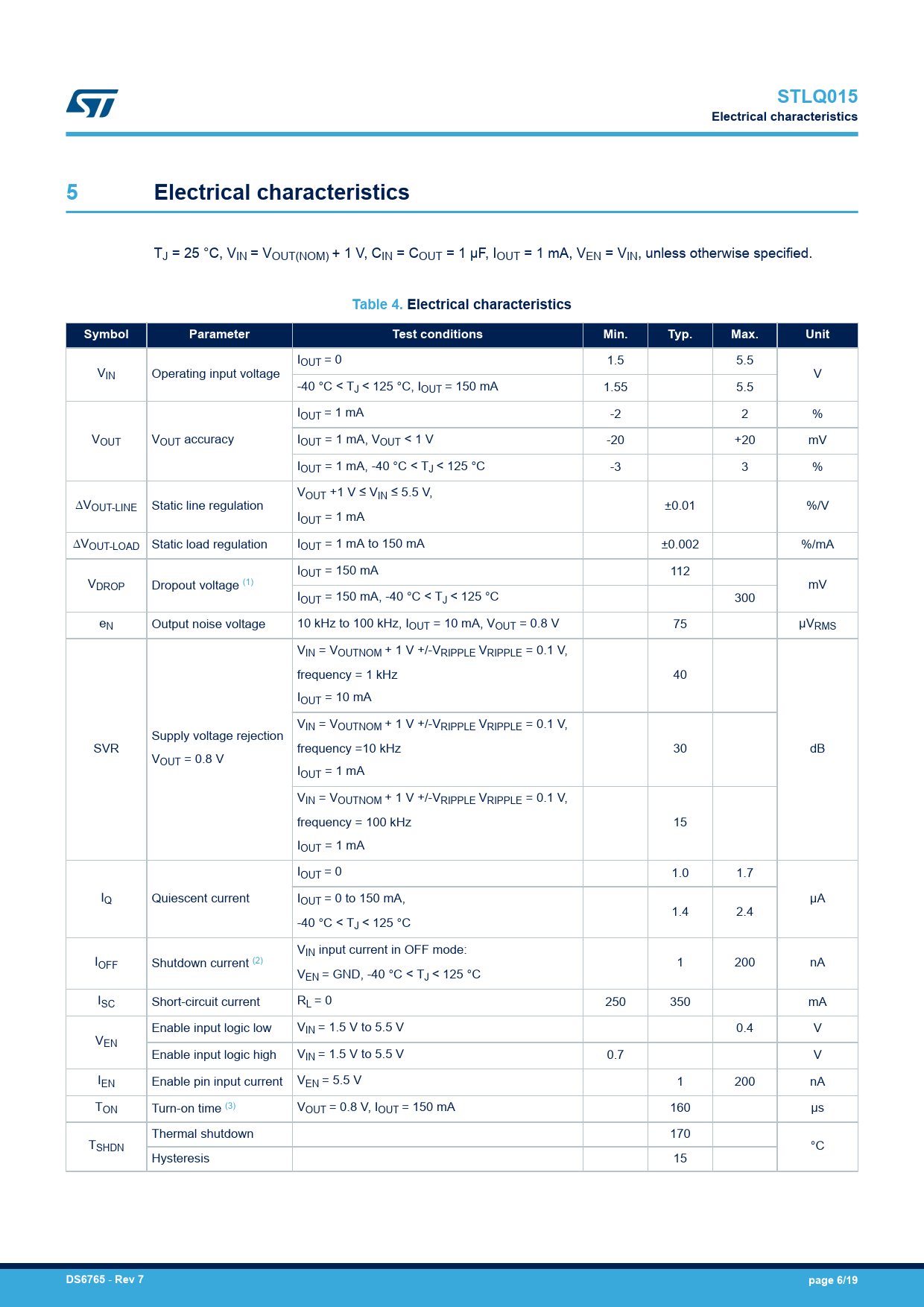 link to page 7 link to page 7 link to page 7 STLQ015Electrical characteristics5Electrical characteristics TJ = 25 °C, VIN = VOUT(NOM) + 1 V, CIN = COUT = 1 µF, IOUT = 1 mA, VEN = VIN, unless otherwise specified. Table 4. Electrical characteristicsSymbolParameterTest conditionsMin.Typ.Max.Unit IOUT = 0 1.5 5.5 VIN Operating input voltage V -40 °C < TJ < 125 °C, IOUT = 150 mA 1.55 5.5 IOUT = 1 mA -2 2 % VOUT VOUT accuracy IOUT = 1 mA, VOUT < 1 V -20 +20 mV IOUT = 1 mA, -40 °C < TJ < 125 °C -3 3 % VOUT +1 V ≤ VIN ≤ 5.5 V, ∆VOUT-LINE Static line regulation ±0.01 %/V IOUT = 1 mA ∆VOUT-LOAD Static load regulation IOUT = 1 mA to 150 mA ±0.002 %/mA IOUT = 150 mA 112 VDROP Dropout voltage (1) mV IOUT = 150 mA, -40 °C < TJ < 125 °C 300 eN Output noise voltage 10 kHz to 100 kHz, IOUT = 10 mA, VOUT = 0.8 V 75 µVRMS VIN = VOUTNOM + 1 V +/-VRIPPLE VRIPPLE = 0.1 V, frequency = 1 kHz 40 IOUT = 10 mA VIN = VOUTNOM + 1 V +/-VRIPPLE VRIPPLE = 0.1 V, Supply voltage rejection SVR frequency =10 kHz 30 dB VOUT = 0.8 V IOUT = 1 mA VIN = VOUTNOM + 1 V +/-VRIPPLE VRIPPLE = 0.1 V, frequency = 100 kHz 15 IOUT = 1 mA IOUT = 0 1.0 1.7 IQ Quiescent current IOUT = 0 to 150 mA, µA 1.4 2.4 -40 °C < TJ < 125 °C VIN input current in OFF mode: IOFF Shutdown current (2) 1 200 nA VEN = GND, -40 °C < TJ < 125 °C ISC Short-circuit current RL = 0 250 350 mA Enable input logic low VIN = 1.5 V to 5.5 V 0.4 V VEN Enable input logic high VIN = 1.5 V to 5.5 V 0.7 V IEN Enable pin input current VEN = 5.5 V 1 200 nA TON Turn-on time (3) VOUT = 0.8 V, IOUT = 150 mA 160 µs Thermal shutdown 170 TSHDN °C Hysteresis 15 DS6765 - Rev 7page 6/19 Document Outline 1 Block diagram 2 Pin configuration and description 3 Typical application 4 Maximum ratings 5 Electrical characteristics 6 Typical performance characteristics 7 Package information 7.1 SOT23-5L mechanical data 7.2 SOT23-5L packing information 8 Ordering information Revision history Contents List of tables List of figures Disclaimer