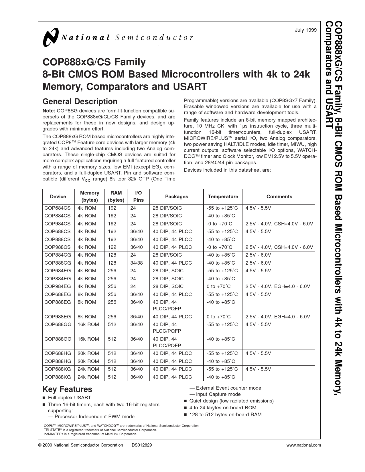 — Input Capture mode n Full duplex USART n Quiet design (low radiated emissions) n Three 16-bit timers, each with two 16-bit registers n 4 to 24 kbytes on-board ROM supporting: — Processor Independent PWM mode n 128 to 512 bytes on-board RAM COP8™, MICROWIRE/PLUS™, and WATCHDOG™ are trademarks of National Semiconductor Corporation. TRI-STATE® is a registered trademark of National Semiconductor Corporation. iceMASTER® is a registered trademark of MetaLink Corporation. © 2000 National Semiconductor Corporation DS012829 www.national.com