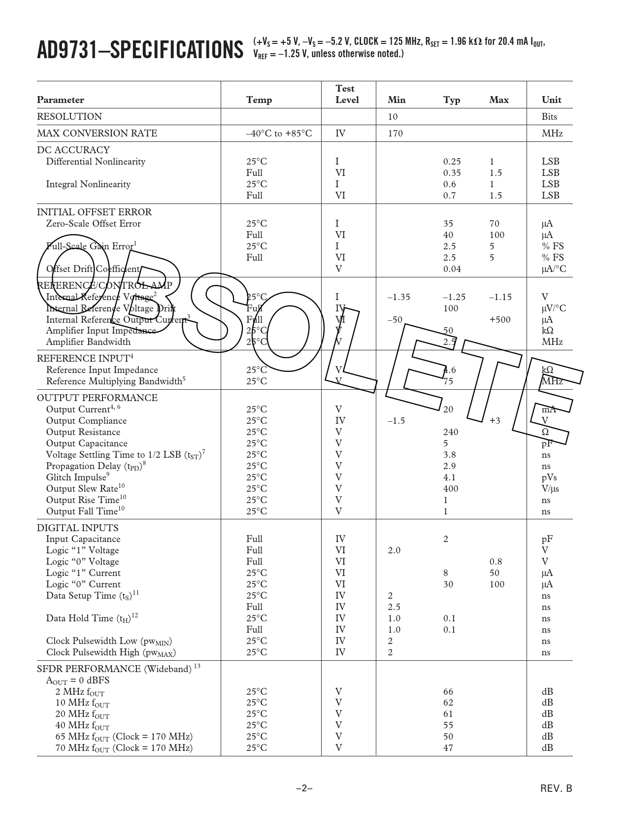 AD9731–SPECIFICATIONS (+VS = +5 V, –VS = –5.2 V, CLOCK = 125 MHz, RSET = 1.96 k. for 20.4 mA IOUT,