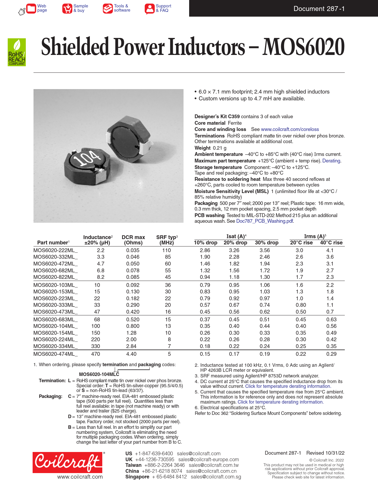 Shielded Power Inductors – MOS6020. Designer’s Kit C359. Core material. Core and winding loss. Terminations. Weight