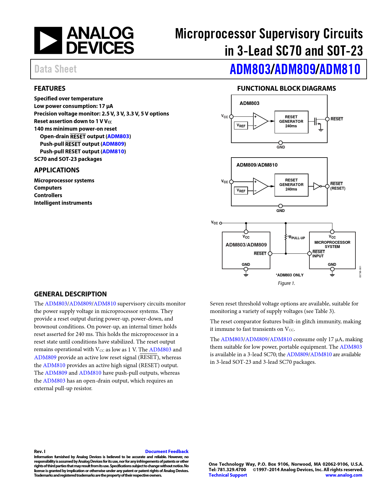 Microprocessor Supervisory Circuits. in 3-Lead SC70 and SOT-23. Data Sheet. ADM803/. ADM809/. ADM810. FEATURES
