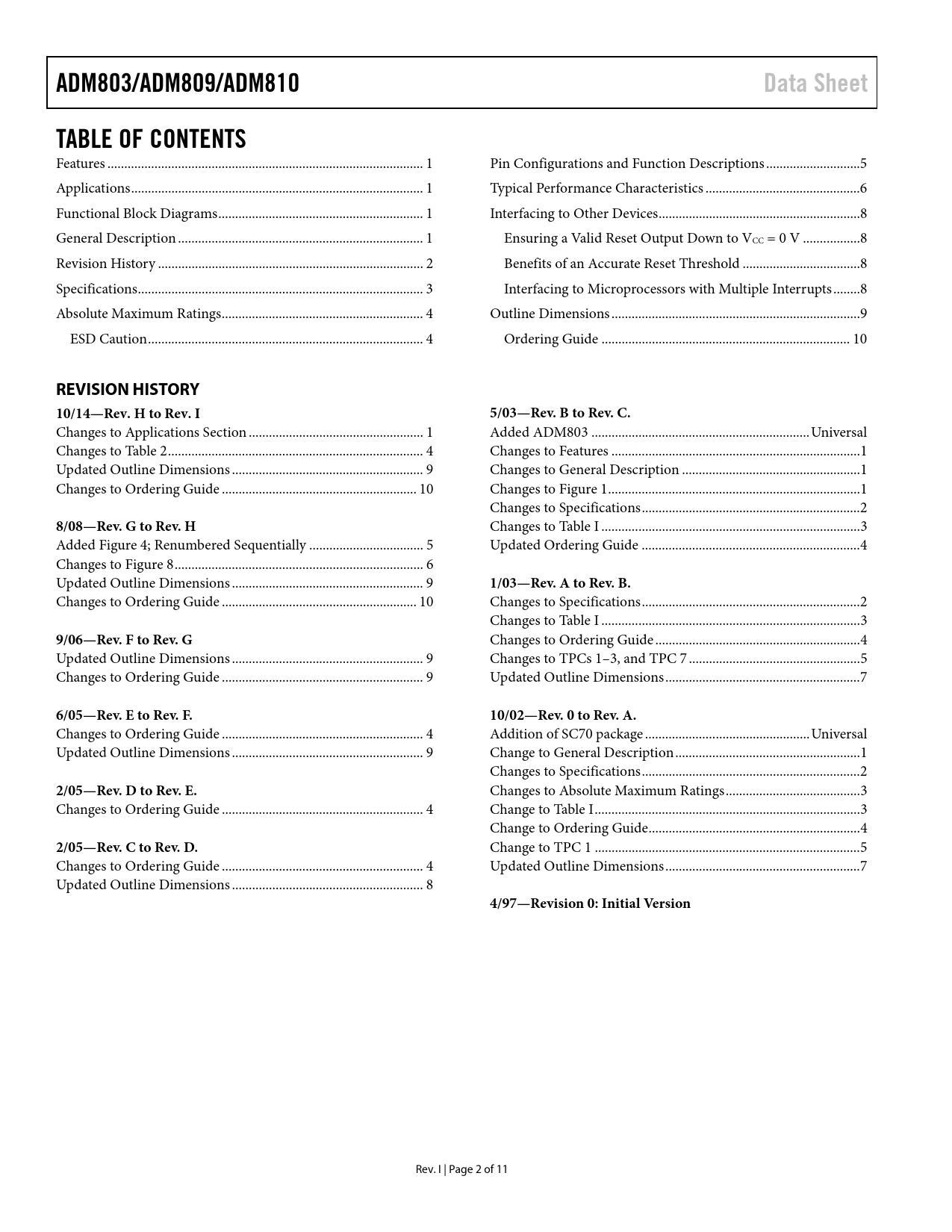 link to page 1 link to page 1 link to page 1 link to page 1 link to page 2 link to page 3 link to page 4 link to page 4 link to page 5 link to page 6 link to page 8 link to page 8 link to page 8 link to page 8 link to page 9 link to page 10 ADM803/ADM809/ADM810Data SheetTABLE OF CONTENTS Features .. 1 Pin Configurations and Function Descriptions ..5 Applications ... 1 Typical Performance Characteristics ..6 Functional Block Diagrams ... 1 Interfacing to Other Devices ..8 General Description ... 1 Ensuring a Valid Reset Output Down to VCC = 0 V ...8 Revision History ... 2 Benefits of an Accurate Reset Threshold ...8 Specifications ... 3 Interfacing to Microprocessors with Multiple Interrupts ..8 Absolute Maximum Ratings .. 4 Outline Dimensions ..9 ESD Caution .. 4 Ordering Guide .. 10 REVISION HISTORY10/14—Rev. H to Rev. I5/03—Rev. B to Rev. C. Changes to Applications Section .. 1 Added ADM803 ... Universal Changes to Table 2 .. 4 Changes to Features .. 1 Updated Outline Dimensions ... 9 Changes to General Description ... 1 Changes to Ordering Guide .. 10 Changes to Figure 1 ... 1 Changes to Specifications ... 2 8/08—Rev. G to Rev. H Changes to Table I ... 3 Added Figure 4; Renumbered Sequentially .. 5 Updated Ordering Guide ... 4 Changes to Figure 8 .. 6 Updated Outline Dimensions ... 9 1/03—Rev. A to Rev. B. Changes to Ordering Guide .. 10 Changes to Specifications ... 2 Changes to Table I ... 3 9/06—Rev. F to Rev. G Changes to Ordering Guide ... 4 Updated Outline Dimensions ... 9 Changes to TPCs 1–3, and TPC 7 ... 5 Changes to Ordering Guide .. 9 Updated Outline Dimensions .. 7 6/05—Rev. E to Rev. F.10/02—Rev. 0 to Rev. A. Changes to Ordering Guide .. 4 Addition of SC70 package ... Universal Updated Outline Dimensions ... 9 Change to General Description ... 1 Changes to Specifications ... 2 2/05—Rev. D to Rev. E. Changes to Absolute Maximum Ratings .. 3 Changes to Ordering Guide .. 4 Change to Table I ... 3 Change to Ordering Guide ... 4 2/05—Rev. C to Rev. D. Change to TPC 1 ... 5 Changes to Ordering Guide .. 4 Updated Outline Dimensions .. 7 Updated Outline Dimensions ... 8 4/97—Revision 0: Initial Version Rev. I | Page 2 of 11 Document Outline FEATURES APPLICATIONS FUNCTIONAL BLOCK DIAGRAMS GENERAL DESCRIPTION TABLE OF CONTENTS REVISION HISTORY SPECIFICATIONS ABSOLUTE MAXIMUM RATINGS ESD CAUTION PIN CONFIGURATIONS AND FUNCTION DESCRIPTIONS TYPICAL PERFORMANCE CHARACTERISTICS INTERFACING TO OTHER DEVICES ENSURING A VALID RESET OUTPUT DOWN TO VCC = 0 V BENEFITS OF AN ACCURATE RESET THRESHOLD INTERFACING TO MICROPROCESSORS WITH MULTIPLE INTERRUPTS OUTLINE DIMENSIONS ORDERING GUIDE