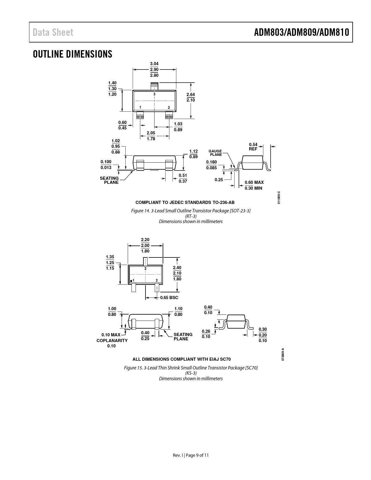 Data Sheet ADM803/ADM809/ADM810 OUTLINE DIMENSIONS 3.04 2.90 2.80 1.40 1.30 1.20 3 2.64 2.10 1 2 0.60 1.03 0.45 0.89 2.05 1.78 1.02 0.54 0.95 REF 1.12 GAUGE 0.88 PLANE 0.89 0.100 0.180 0.013 0.085 0.51 SEATING 0.25 PLANE 0.37 0.60 MAX 0.30 MIN C COMPLIANT TO JEDEC STANDARDS TO-236-AB 011909-