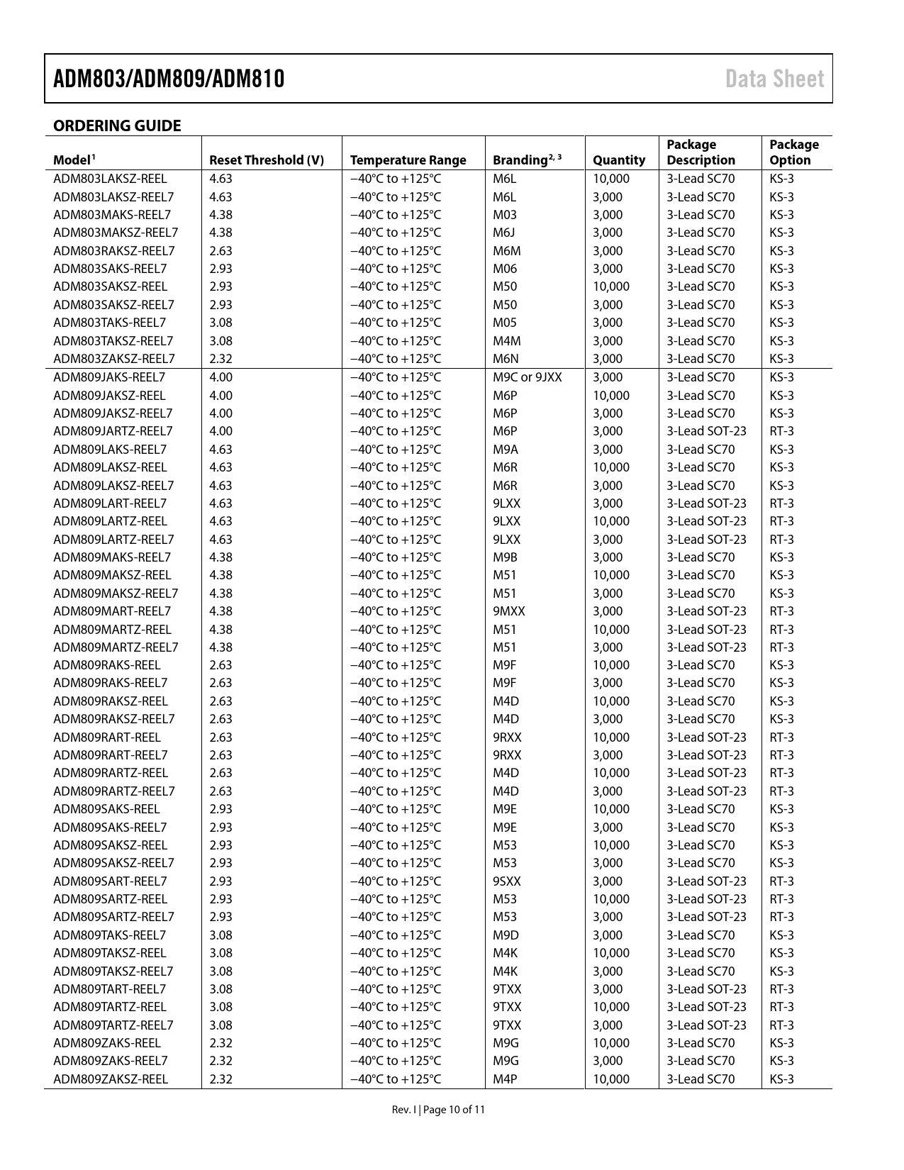 ADM803/ADM809/ADM810. Data Sheet. ORDERING GUIDE. Package. Model1. Reset Threshold (V). Temperature Range. Branding2, 3. Quantity