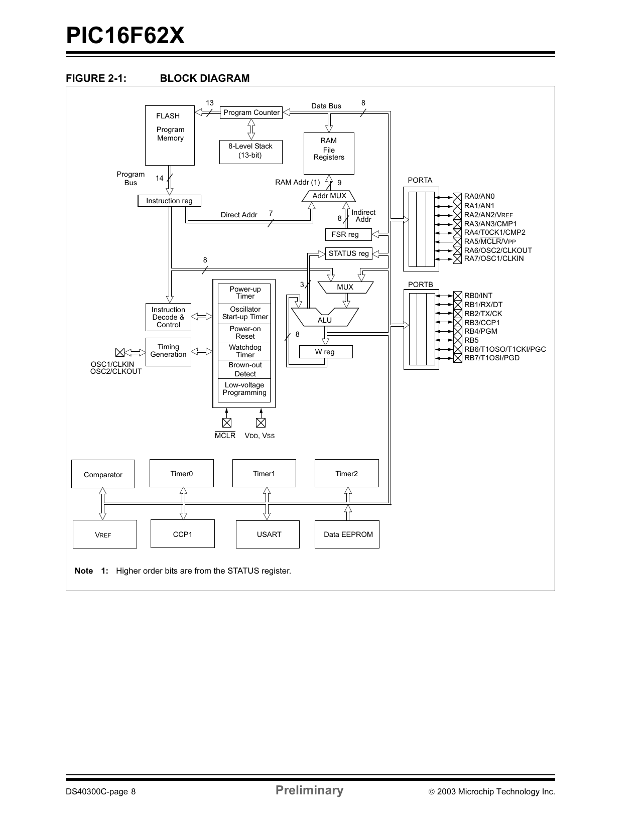 PIC16F62X. FIGURE. 2-1:. BLOCK. DIAGRAM. 13. Data. Bus. 8. Program. Counter. FLASH. Program. Memory. RAM. 8-Level. Stack. File. (13-bit). Registers. Program. 14
