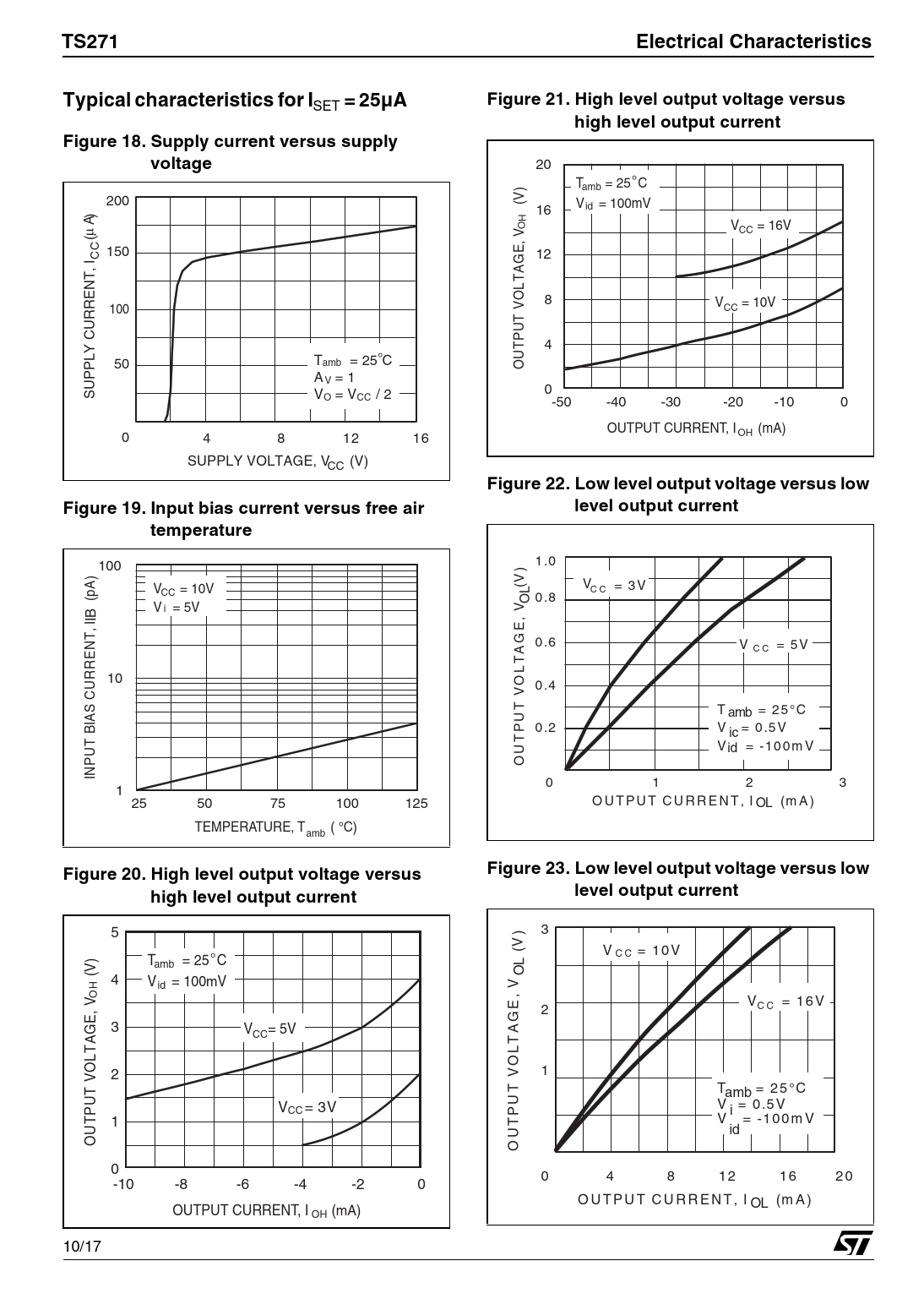 TS271Electrical CharacteristicsTypical characteristics for IFigure 21. High level output voltage versus SET = 25µAhigh level output currentFigure 18. Supply current versus supplyvoltage 20 ° amb T = 25 C 200 (V) id V = 100mV ) 16 A H µ O V = 16V ( CC V , E CC 150 I 12 AG T NT, L O 8 V V = 10V CC RRE 100 T U U C P Y T 4 U amb ° T = 25 C 50 O PPL A V = 1 U S V 0 O = VCC / 2 -50 -40 -30 -20 -10 0 OUTPUT CURRENT, I (mA) 0 4 8 12 16 OH SUPPLY VOLTAGE, CC V (V) Figure 22. Low level output voltage versus lowFigure 19. Input bias current versus free airlevel output currenttemperature 100 1 .0 ) A V = 10V (V) VC C = 3 V (p CC OL 0 .8 V = 5V i V IIB E, NT, 0 .6 V = 5 V C C AG RE T L 10 O 0.4 CUR V S T T amb = 2 5°C IA U B P 0 .2 V ic = 0.5V T T U V U id = -1 0 0 m V P O IN 0 1 2 3 1 25 50 75 100 125 O U T P U T C U R R E N T , I (m A ) OL TEMPERATURE, T ( °C) amb Figure 20. High level output voltage versusFigure 23. Low level output voltage versus lowhigh level output currentlevel output current 5 ) 3 (V V C C = 1 0 V ) ° amb T = 25 C (V OL 4 id V = 100mV V V OH E, V = 1 6 V 2 C C E, G 3 V = 5V AG A CC T L LT O 1 VO 2 V T T amb T = 2 5 °C U U P V V = 0 .5 V CC = 3V P i T 1 T V = -1 0 0 m V U U id O O 0 0 4 8 1 2 1 6 2 0 -10 -8 -6 -4 -2 0 O U T P U T C U R R E N T , I (m A ) OL OUTPUT CURRENT OH , I (mA) 10/17 Document Outline 1 Block Diagram 2 Absolute Maximum Ratings 3 Electrical Characteristics 4 Electrical Characteristics 5 Electrical Characteristics 6 Package Mechanical Data 7 Revision History