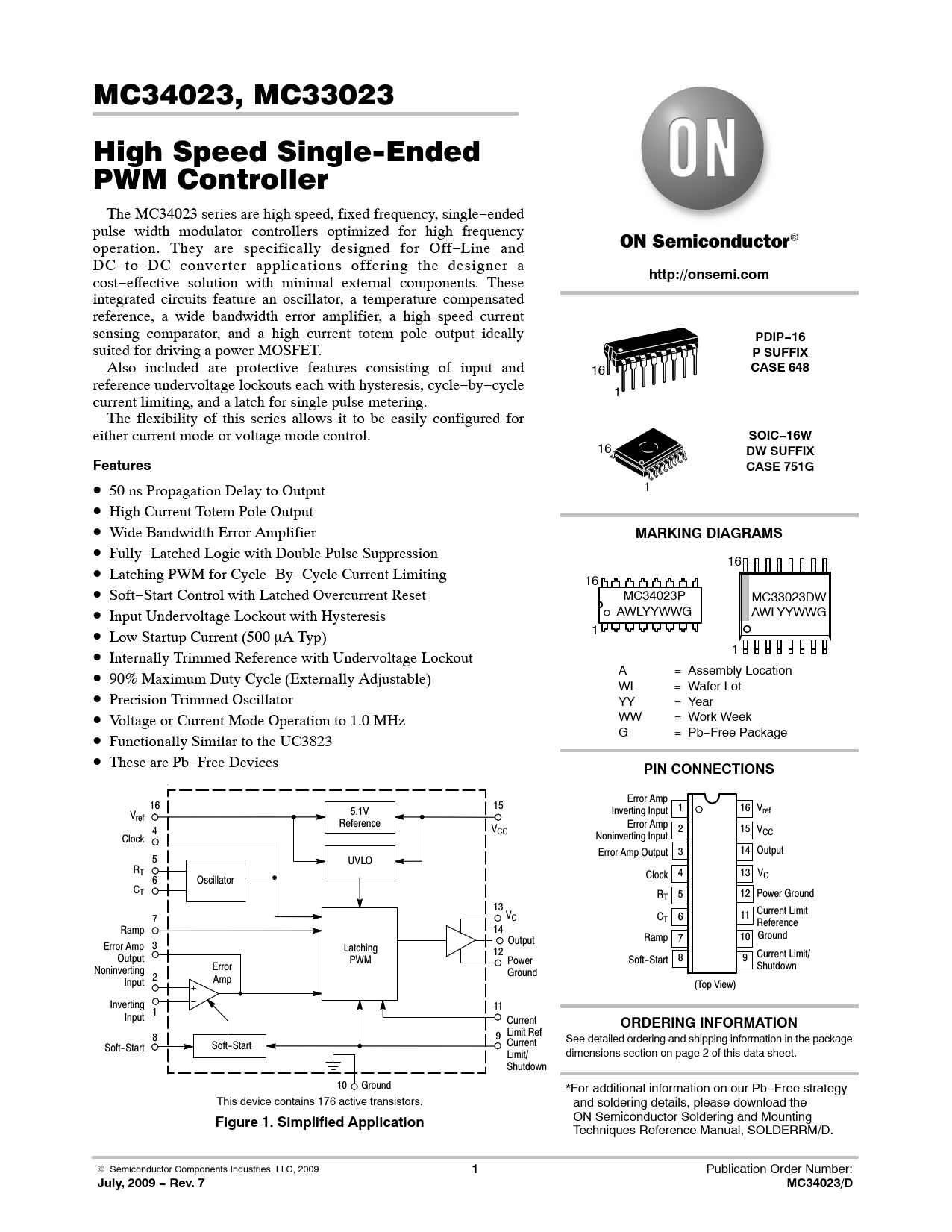 link to page 3 MC34023, MC33023 High Speed Single-Ended PWM Controller The MC34023 series are high speed, fixed frequency, single−ended pulse width modulator controllers optimized for high frequency operation. They are specifically designed for Off−Line and DC−to−DC converter applications offering the designer a cost−effective solution with minimal external components. These