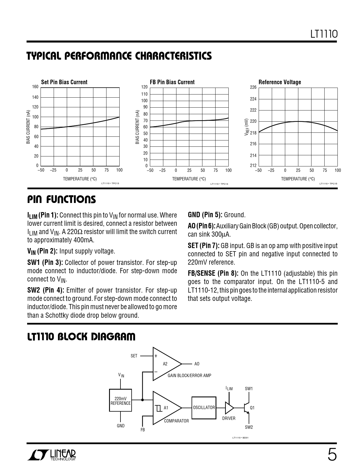 LT1110 WUTYPICAL PERFOR A CE CHAR CA TERISTICSSet Pin Bias CurrentFB Pin Bias CurrentReference Voltage 160 120 226 110 140 224 100 120 90 222 80 100 70 220 80 60 (mV) REF 50 V 218 60 40 BIAS CURRENT (nA) BIAS CURRENT (nA) 216 40 30 20 20 214 10 0 0 212 –50 –25 0 25 50 75 100 –50 –25 0 25 50 75 100 –50 –25 0 25 50 75 100 TEMPERATURE (°C) TEMPERATURE (°C) TEMPERATURE (°C) LT1110 • TPC13 LT1110 • TPC14 LT1110 • TPC15 UUOUPIFU CTISILIM (Pin 1): Connect this pin to VIN for normal use. Where GND (Pin 5): Ground. lower current limit is desired, connect a resistor between AO (Pin 6): Auxiliary Gain Block (GB) output. Open collector, ILIM and VIN. A 220Ω resistor will limit the switch current can sink 300µA. to approximately 400mA. SET (Pin 7): GB input. GB is an op amp with positive input VIN (Pin 2): Input supply voltage. connected to SET pin and negative input connected to SW1 (Pin 3): Collector of power transistor. For step-up 220mV reference. mode connect to inductor/diode. For step-down mode FB/SENSE (Pin 8): On the LT1110 (adjustable) this pin connect to VIN. goes to the comparator input. On the LT1110-5 and SW2 (Pin 4): Emitter of power transistor. For step-up LT1110-12, this pin goes to the internal application resistor mode connect to ground. For step-down mode connect to that sets output voltage. inductor/diode. This pin must never be allowed to go more than a Schottky diode drop below ground. WLT1110 BLOCKID AGRA SET + A2 AO – VIN GAIN BLOCK/ERROR AMP ILIM SW1 220mV REFERENCE A1 OSCILLATOR Q1 DRIVER COMPARATOR GND SW2 FB LT1110 • BD01 5