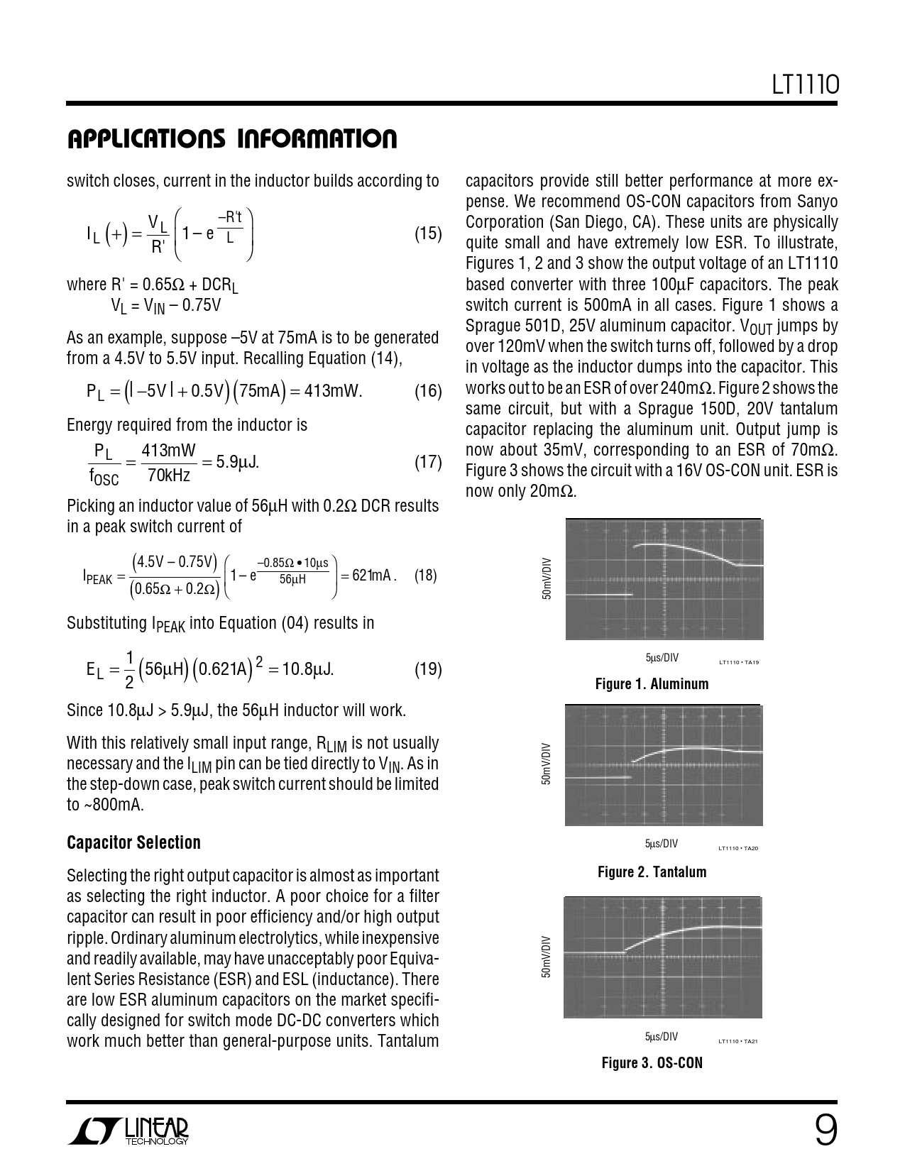 as selecting the right inductor. A poor choice for a filter capacitor can result in poor efficiency and/or high output ripple. Ordinary aluminum electrolytics, while inexpensive and readily available, may have unacceptably poor Equiva- lent Series Resistance (ESR) and ESL (inductance). There 50mV/DIV are low ESR aluminum capacitors on the market specifi- cally designed for switch mode DC-DC converters which work much better than general-purpose units. Tantalum 5 s/DIV µ LT1110 • TA21