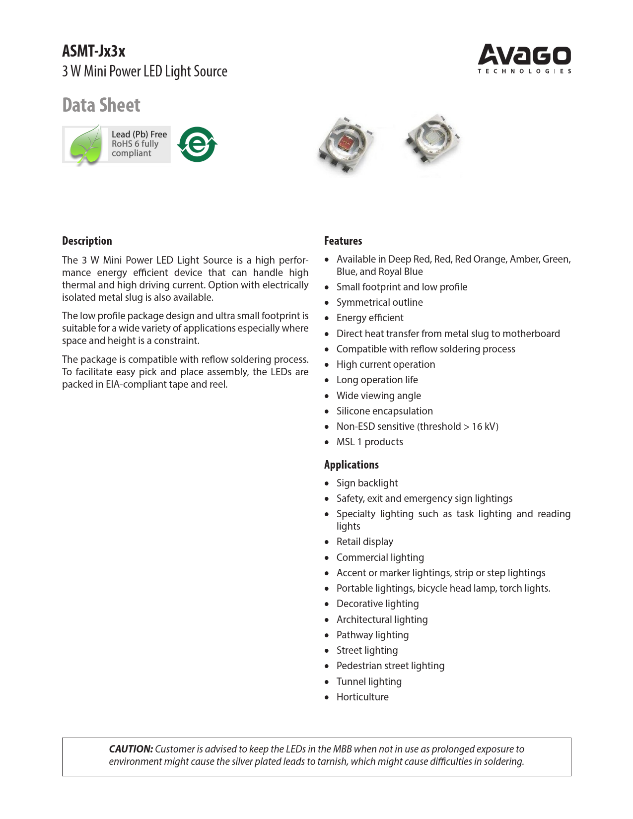 ASMT-Jx3x 3 W Mini Power LED Light Source Data SheetDescriptionFeatures The 3 W Mini Power LED Light Source is a high perfor- • Available in Deep Red, Red, Red Orange, Amber, Green, mance energy efficient device that can handle high Blue, and Royal Blue thermal and high driving current. Option with electrically • Small footprint and low profile isolated metal slug is also available. • Symmetrical outline The low profile package design and ultra small footprint is • Energy efficient suitable for a wide variety of applications especially where • Direct heat transfer from metal slug to motherboard space and height is a constraint. • Compatible with reflow soldering process The package is compatible with reflow soldering process. • High current operation To facilitate easy pick and place assembly, the LEDs are packed in EIA-compliant tape and reel. • Long operation life • Wide viewing angle • Silicone encapsulation • Non-ESD sensitive (threshold > 16 kV) • MSL 1 products Applications • Sign backlight • Safety, exit and emergency sign lightings • Specialty lighting such as task lighting and reading lights • Retail display • Commercial lighting • Accent or marker lightings, strip or step lightings • Portable lightings, bicycle head lamp, torch lights. • Decorative lighting • Architectural lighting • Pathway lighting • Street lighting • Pedestrian street lighting • Tunnel lighting • Horticulture CAUTION: Customer is advised to keep the LEDs in the MBB when not in use as prolonged exposure to environment might cause the silver plated leads to tarnish, which might cause difficulties in soldering.