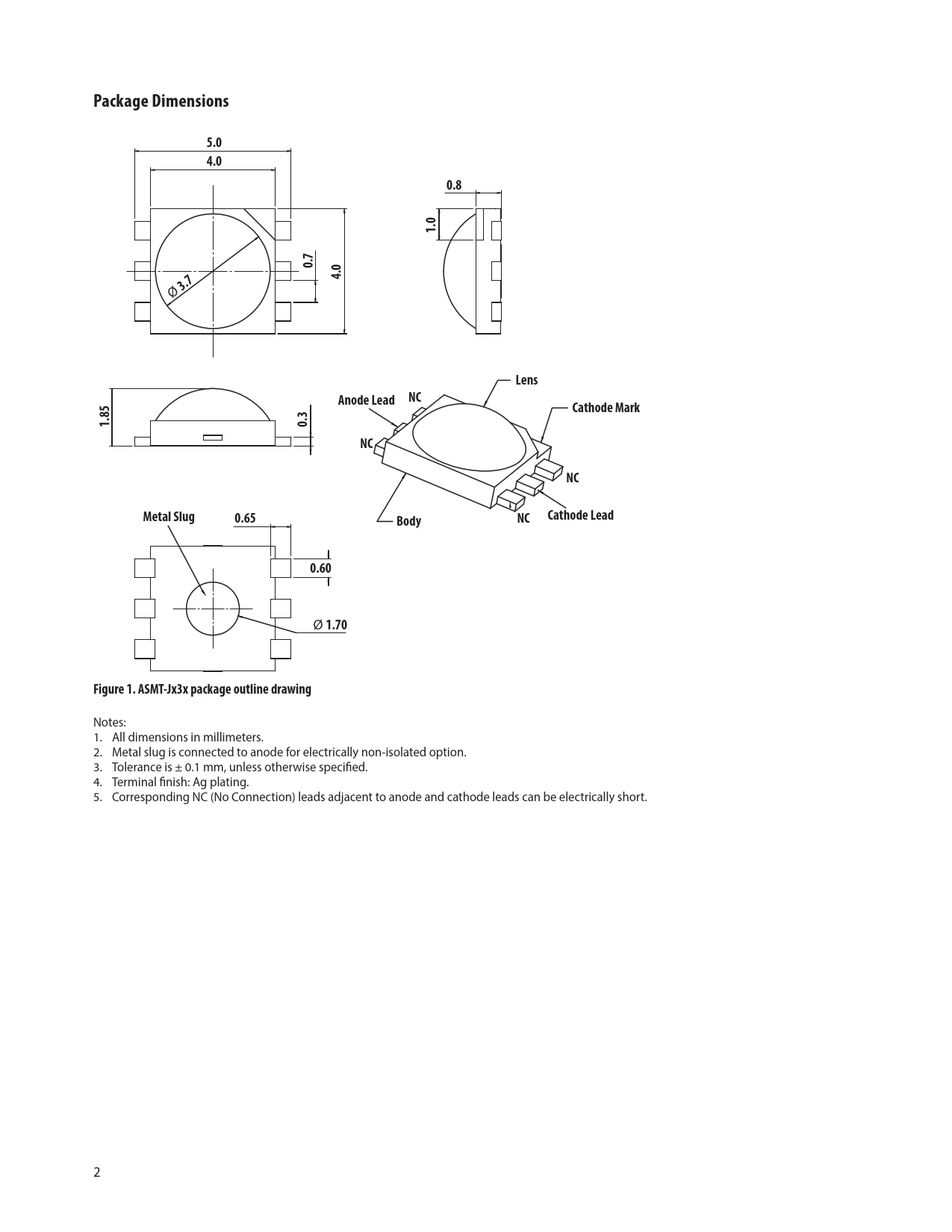 Package Dimensions. 5.0 4.0. 0.8. 1.0. 0.7. 4.0. 3.7. Lens. Anode Lead NC. Cathode Mark. 0.3. 1.85. Metal Slug. 0.65. Body. Cathode Lead. 0.60. 1.70