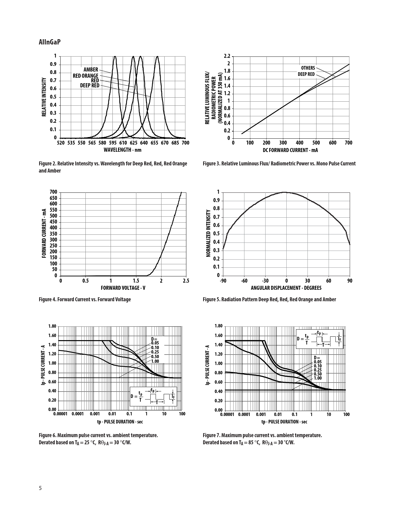 AlInGaP. 2.2. 0.9. OTHERS. 0.8. AMBER. 1.8. RED ORANGE. DEEP RED. 0.7. RED. 1.6. 0.6. 1.4. 0.5. 1.2. 0.4. 0.3. RELATIVE INTENSITY. RADIOMETRIC POWER. 0.2