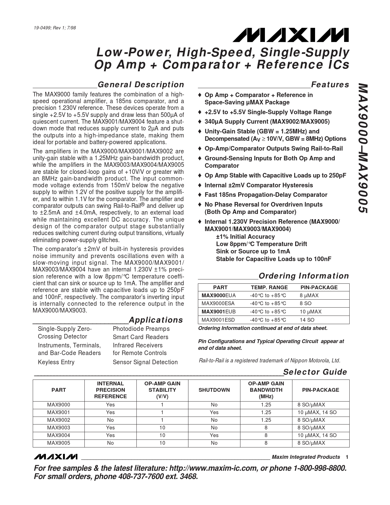 19-0499; Rev 1; 7/98 Low-Power, High-Speed, Single-SupplyOp Amp + Comparator + Reference ICsMAX9000–MAX9005General DescriptionFeatures The MAX9000 family features the combination of a high- ♦ Op Amp + Comparator + Reference in speed operational amplifier, a 185ns comparator, and a Space-Saving µMAX Package precision 1.230V reference. These devices operate from a ♦ single +2.5V to +5.5V supply and draw less than 500µA of +2.5V to +5.5V Single-Supply Voltage Range quiescent current. The MAX9001/MAX9004 feature a shut- ♦ 340µA Supply Current (MAX9002/MAX9005) down mode that reduces supply current to 2µA and puts ♦ Unity-Gain Stable (GBW = 1.25MHz) and the outputs into a high-impedance state, making them Decompensated (A ideal for portable and battery-powered applications. V ≥ 10V/V, GBW = 8MHz) Options ♦ The amplifiers in the MAX9000/MAX9001/MAX9002 are Op-Amp/Comparator Outputs Swing Rail-to-Rail unity-gain stable with a 1.25MHz gain-bandwidth product, ♦ Ground-Sensing Inputs for Both Op Amp and while the amplifiers in the MAX9003/MAX9004/MAX9005 Comparator are stable for closed-loop gains of +10V/V or greater with ♦ Op Amp Stable with Capacitive Loads up to 250pF an 8MHz gain-bandwidth product. The input common- mode voltage extends from 150mV below the negative ♦ Internal ±2mV Comparator Hysteresis supply to within 1.2V of the positive supply for the amplifi- ♦ Fast 185ns Propagation-Delay Comparator er, and to within 1.1V for the comparator. The amplifier and comparator outputs can swing Rail-to-Rail® and deliver up ♦ No Phase Reversal for Overdriven Inputs to ±2.5mA and ±4.0mA, respectively, to an external load (Both Op Amp and Comparator) while maintaining excellent DC accuracy. The unique ♦ Internal 1.230V Precision Reference (MAX9000/ design of the comparator output stage substantially MAX9001/MAX9003/MAX9004) reduces switching current during output transitions, virtually ±1% Initial Accuracy eliminating power-supply glitches. Low 8ppm/°C Temperature Drift The comparator’s ±2mV of built-in hysteresis provides Sink or Source up to 1mA noise immunity and prevents oscillations even with a Stable for Capacitive Loads up to 100nF slow-moving input signal. The MAX9000/MAX9001/ MAX9003/MAX9004 have an internal 1.230V ±1% preci- sion reference with a low 8ppm/°C temperature coeffi- Ordering Information cient that can sink or source up to 1mA. The amplifier and reference are stable with capacitive loads up to 250pF PARTTEMP. RANGEPIN-PACKAGE and 100nF, respectively. The comparator’s inverting input MAX9000 EUA -40°C to +85°C 8 µMAX is internally connected to the reference output in the MAX9000ESA -40°C to +85°C 8 SO MAX9000/MAX9003. MAX9001 EUB -40°C to +85°C 10 µMAX ________________________Applications MAX9001ESD -40°C to +85°C 14 SO Single-Supply Zero- Photodiode Preamps Ordering Information continued at end of data sheet. Crossing Detector Smart Card Readers Pin Configurations and Typical Operating Circuit appear at Instruments, Terminals, Infrared Receivers end of data sheet. and Bar-Code Readers for Remote Controls Keyless Entry Sensor Signal Detection Rail-to-Rail is a registered trademark of Nippon Motorola, Ltd. ______________________________________________________________________________Selector GuideINTERNALOP-AMP GAINOP-AMP GAINPARTPRECISIONSTABILITYSHUTDOWNBANDWIDTHPIN-PACKAGEREFERENCE(V/V)(MHz) MAX9000 Yes 1 No 1.25 8 SO/µMAX MAX9001 Yes 1 Yes 1.25 10 µMAX, 14 SO MAX9002 No 1 No 1.25 8 SO/µMAX MAX9003 Yes 10 No 8 8 SO/µMAX MAX9004 Yes 10 Yes 8 10 µMAX, 14 SO MAX9005 No 10 No 8 8 SO/µMAX ________________________________________________________________ Maxim Integrated Products1For free samples & the latest literature: http://www.maxim-ic.com, or phone 1-800-998-8800. For small orders, phone 408-737-7600 ext. 3468.