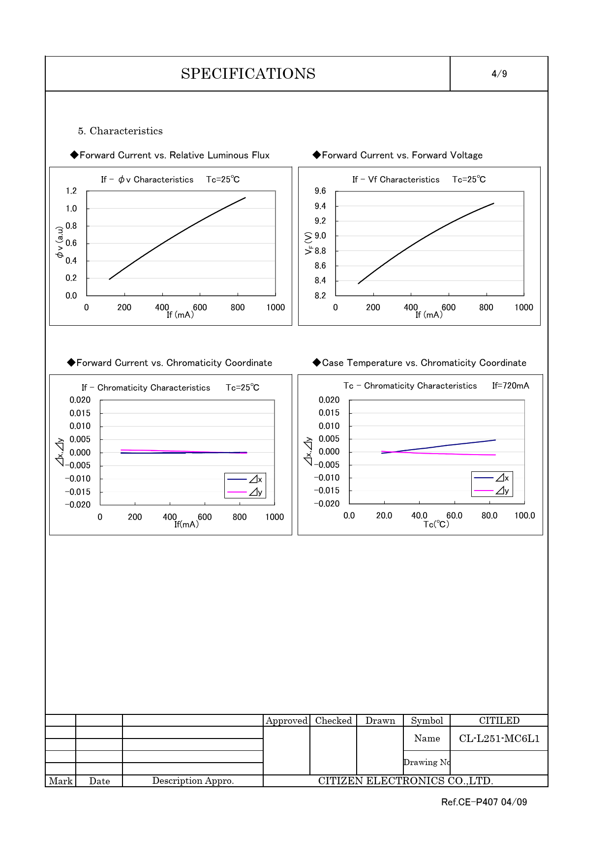 SPECIFICATIONS 4/9 5. Characteristics ◆Forward Current vs. Relative Luminous Flux ◆Forward Current vs. Forward Voltage If - φv Characteristics Tc=25℃ If - Vf Characteristics Tc=25℃ 1.2 9.6 1.0 9.4 9.2 ) 0.8 ) 9.0 0.6 (V v (a.u FV 8.8 φ 0.4 8.6 0.2 8.4 0.0 8.2 0 200 400 600 800 1000 0 200 400 600 800 1000 If (mA) If (mA) ◆Forward Current vs. Chromaticity Coordinate ◆Case Temperature vs. Chromaticity Coordinate If - Chromaticity Characteristics Tc=25℃ Tc - Chromaticity Characteristics If=720mA 0.020 0.020 0.015 0.015 0.010 0.010 y 0.005 y 0.005 0.000 x,⊿ 0.000 x,⊿ ⊿ -0.005 ⊿ -0.005 -0.010 ⊿x -0.010 ⊿x -0.015 ⊿y -0.015 ⊿y -0.020 -0.020 0 200 400 600 800 1000 0.0 20.0 40.0 60.0 80.0 100.0 If(mA) Tc(℃) Approved Checked Drawn Symbol CITILED Name CL-L251-MC6L1 Drawing No Mark Date Description Appro. CITIZEN ELECTRONICS CO.,LTD. Ref.CE-P407 04/09