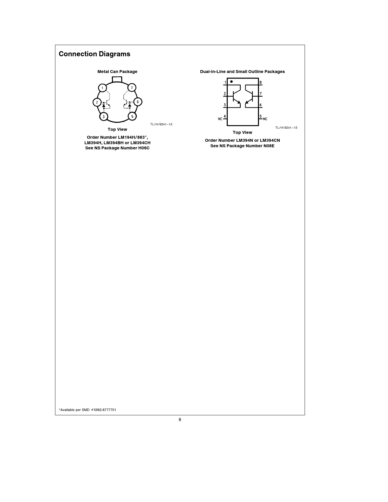 Connection Diagrams Metal Can Package Dual-In-Line and Small Outline Packages TL/H/9241 – 12 Top View TL/H/9241 – 13 Top View Order Number LM194H/883*, Order Number LM394N or LM394CN LM394H, LM394BH or LM394CH See NS Package Number N08E See NS Package Number H06C *Available per SMD Ý5962-8777701 8