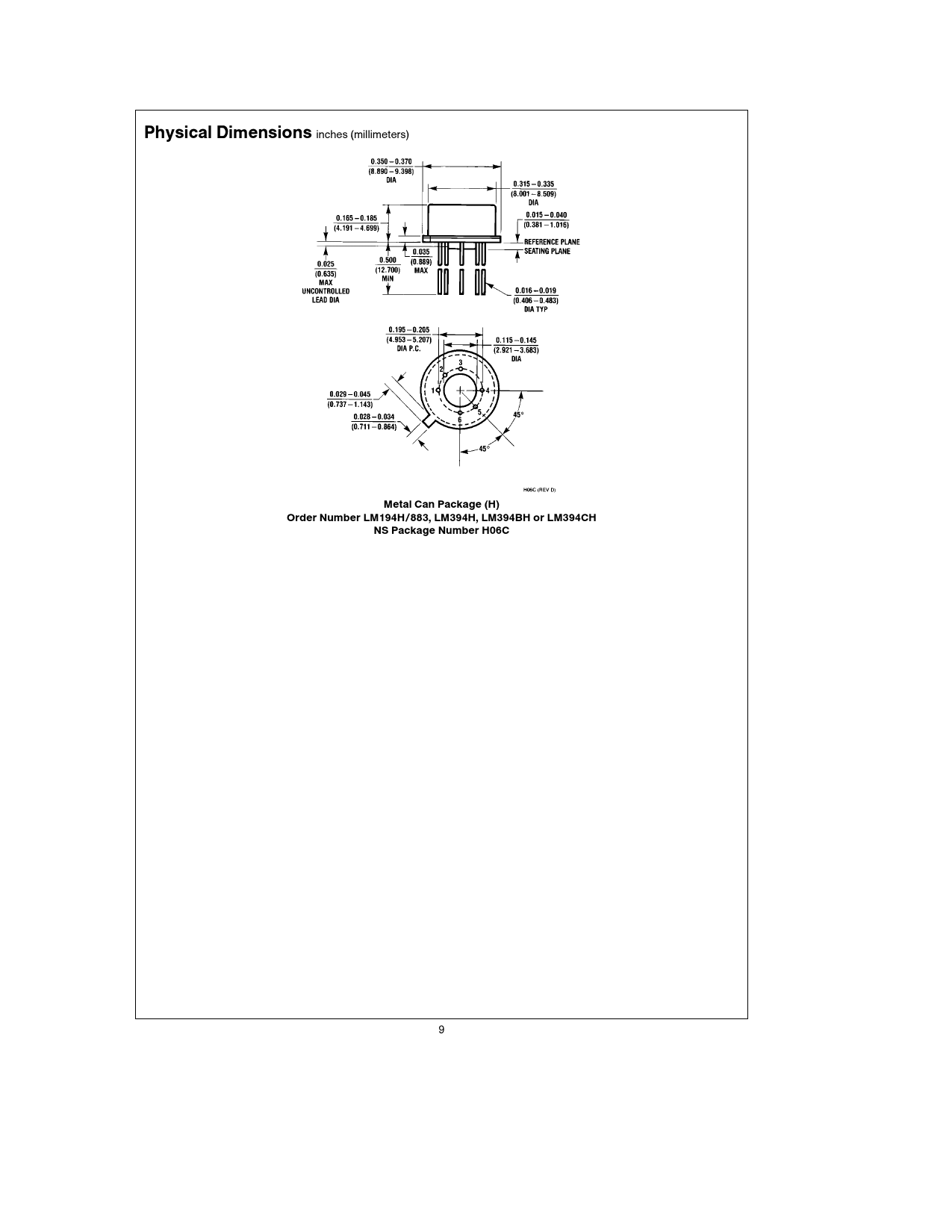 Physical. Dimensions. inches. (millimeters). Metal. Can. Package. (H). Order. Number. LM194H/883,. LM394H,. LM394BH. or. LM394CH. NS. Package. Number. H06C