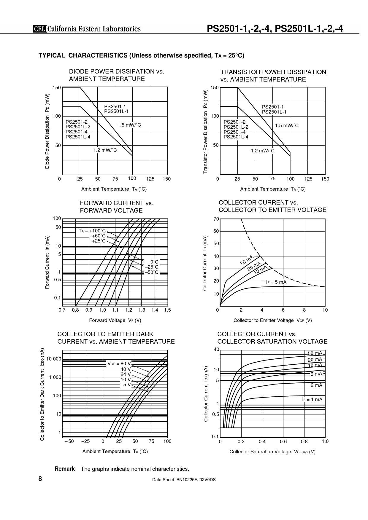 PS2501-1,-2,-4, PS2501L-1,-2,-4TYPICAL CHARACTERISTICS (Unless otherwise specified, TA = 25 ° C) DIODE POWER DISSIPATION vs. TRANSISTOR POWER DISSIPATION AMBIENT TEMPERATURE vs. AMBIENT TEMPERATURE 150 150 (mW) (mW) C PS2501-1 D PS2501-1 PS2501L-1 PS2501L-1 100 100 PS2501-2 PS2501-2 1.5 mW/˚C 1.5 mW/˚C PS2501L-2 PS2501L-2 PS2501-4 PS2501-4 PS2501L-4 PS2501L-4 50 50 1.2 mW/˚C 1.2 mW/˚C Diode Power Dissipation P Transistor Power Dissipation P 0 25 50 75 100 125 150 0 25 50 75 100 125 150 Ambient Temperature TA (˚C) Ambient Temperature TA (˚C) FORWARD CURRENT vs. COLLECTOR CURRENT vs. FORWARD VOLTAGE COLLECTOR TO EMITTER VOLTAGE 100 70 50 TA = +100˚C 60 +60˚C +25˚C (mA) 50 10 (mA) F C 5 40 0˚C 50 mA –25˚C 30 20 mA 1 –50˚C 10 mA 0.5 20 IF = 5 mA Forward Current I Collector Current I 10 0.1 0.7 0.8 0.9 1.0 1.1 1.2 1.3 1.4 1.5 0 2 4 6 8 10 Forward Voltage VF (V) Collector to Emitter Voltage VCE (V) COLLECTOR TO EMITTER DARK COLLECTOR CURRENT vs. CURRENT vs. AMBIENT TEMPERATURE COLLECTOR SATURATION VOLTAGE 40 50 mA (nA) 10 000 20 mA CEO VCE = 80 V 10 mA 40 V 10 24 V 5 mA 1 000 (mA) 10 V C 5 5 V 2 mA 100 IF = 1 mA 1 10 0.5 Collector Current I 1 0.1 Collector to Emitter Dark Current I – 50 –25 0 25 50 75 100 0 0.2 0.4 0.6 0.8 1.0 Ambient Temperature TA (˚C) Collector Saturation Voltage VCE(sat) (V) Remark The graphs indicate nominal characteristics. 8 Data Sheet PN10225EJ02V0DS