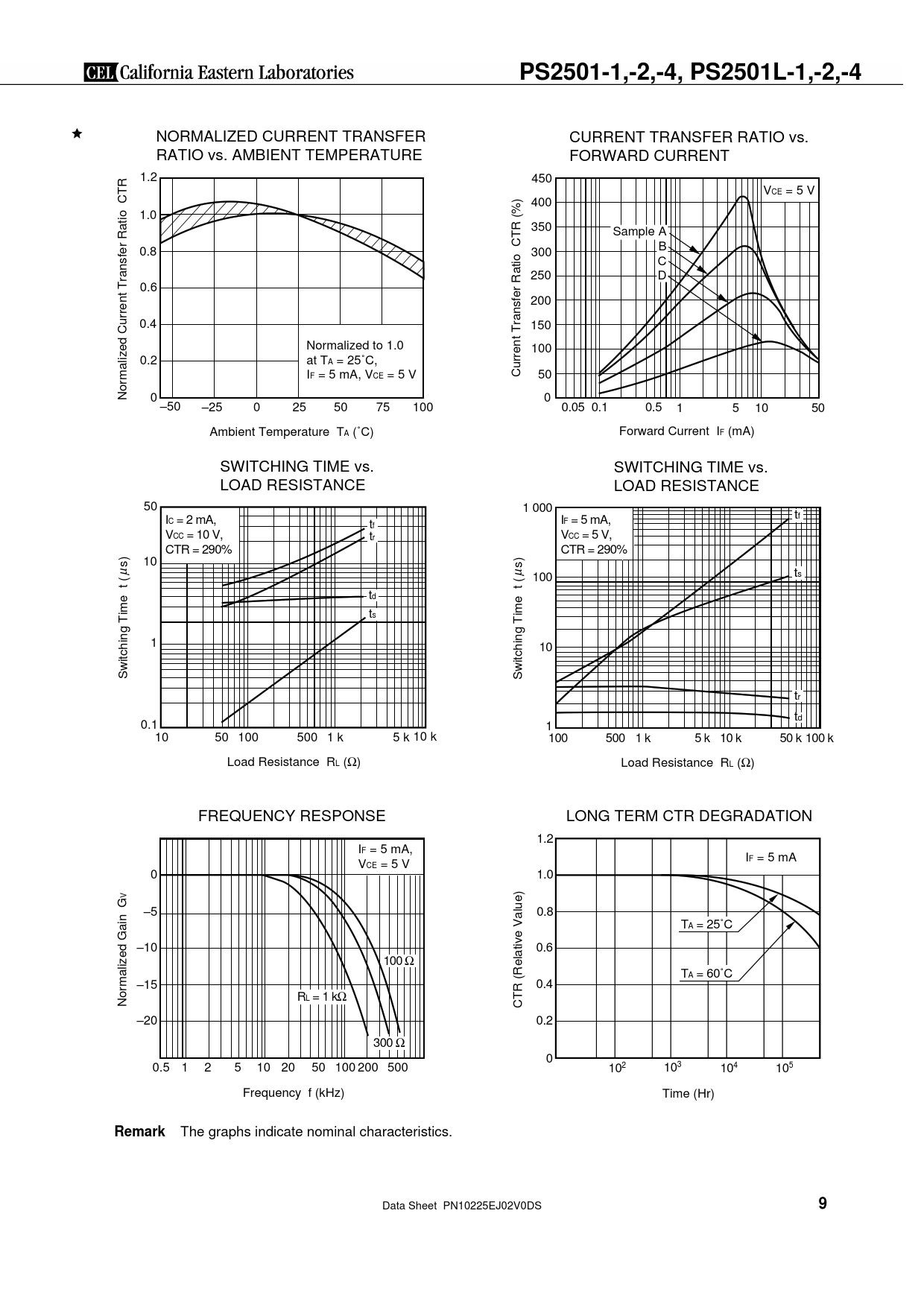 PS2501-1,-2,-4, PS2501L-1,-2,-4 NORMALIZED CURRENT TRANSFER CURRENT TRANSFER RATIO vs. RATIO vs. AMBIENT TEMPERATURE FORWARD CURRENT 1.2 450 VCE = 5 V 400 1.0 350 Sample A 0.8 B 300 C 250 D 0.6 200 0.4 150 Normalized to 1.0 100 0.2 at TA = 25˚C, IF = 5 mA, VCE = 5 V Current Transfer Ratio CTR (%) 50 Normalized Current Transfer Ratio CTR 0 0 –50 –25 0 25 50 75 100 0.05 0.1 0.5 1 5 10 50 Ambient Temperature TA (˚C) Forward Current IF (mA) SWITCHING TIME vs. SWITCHING TIME vs. LOAD RESISTANCE LOAD RESISTANCE 50 1 000 I tf C = 2 mA, t IF = 5 mA, f VCC = 10 V, tr VCC = 5 V, CTR = 290% CTR = 290% 10 µ µ 100 ts td ts 1 10 Switching Time t ( s) Switching Time t ( s) tr td 0.1 1 10 50 100 500 1 k 5 k 10 k 100 500 1 k 5 k 10 k 50 k 100 k Load Resistance RL (Ω) Load Resistance RL (Ω) FREQUENCY RESPONSE LONG TERM CTR DEGRADATION 1.2 IF = 5 mA, I V F = 5 mA CE = 5 V 0 1.0 V –5 0.8 TA = 25˚C –10 0.6 100 Ω TA = 60˚C –15 0.4 RL = 1 kΩ Normalized Gain G CTR (Relative Value) –20 0.2 300 Ω 0 0.5 1 2 5 10 20 50 100 200 500 102 103 104 105 Frequency f (kHz) Time (Hr) Remark The graphs indicate nominal characteristics. Data Sheet PN10225EJ02V0DS 9