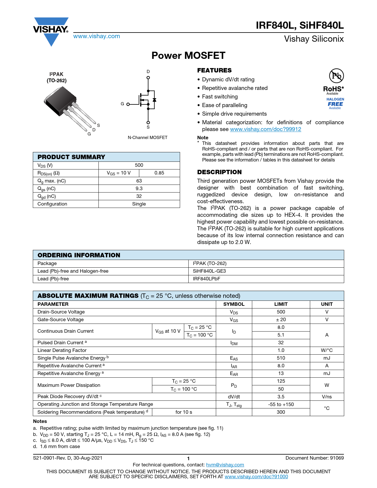 IRF840L, SiHF840L www.vishay.com Vishay Siliconix Power MOSFET D FEATURESI2PAK (TO-262) • Dynamic dV/dt rating • Repetitive avalanche rated Available • Fast switching G • Ease of paralleling Available • Simple drive requirements • Material categorization: for definitions of compliance S S D please see www.vishay.com/doc?99912 G N-Channel MOSFET Note * This datasheet provides information about parts that are RoHS-compliant and / or parts that are non RoHS-compliant. For example, parts with lead (Pb) terminations are not RoHS-compliant. PRODUCT SUMMARY Please see the information / tables in this datasheet for details VDS (V) 500 RDS(on) (Ω) VGS = 10 V 0.85 DESCRIPTION Qg max. (nC) 63 Third generation power MOSFETs from Vishay provide the Q designer with best combination of fast switching, gs (nC) 9.3 ruggedized device design, low on-resistance and Qgd (nC) 32 cost-effectiveness. Configuration Single The I2PAK (TO-262) is a power package capable of accommodating die sizes up to HEX-4. It provides the highest power capability and lowest possible on-resistance. The I2PAK (TO-262) is suitable for high current applications because of its low internal connection resistance and can dissipate up to 2.0 W. ORDERING INFORMATION Package I2PAK (TO-262) Lead (Pb)-free and Halogen-free SiHF840L-GE3 Lead (Pb)-free IRF840LPbF ABSOLUTE MAXIMUM RATINGS (TC = 25 °C, unless otherwise noted) PARAMETER SYMBOLLIMITUNIT Drain-Source Voltage VDS 500 V Gate-Source Voltage VGS ± 20 V TC = 25 °C 8.0 Continuous Drain Current VGS at 10 V ID TC = 100 °C 5.1 A Pulsed Drain Current a IDM 32 Linear Derating Factor 1.0 W/°C Single Pulse Avalanche Energy b EAS 510 mJ Repetitive Avalanche Current a IAR 8.0 A Repetitive Avalanche Energy a EAR 13 mJ TC = 25 °C 125 Maximum Power Dissipation PD W TC = 100 °C 50 Peak Diode Recovery dV/dt c dV/dt 3.5 V/ns Operating Junction and Storage Temperature Range TJ, Tstg -55 to +150 °C Soldering Recommendations (Peak temperature) d for 10 s 300 Notes a. Repetitive rating; pulse width limited by maximum junction temperature (see fig. 11) b. VDD = 50 V, starting TJ = 25 °C, L = 14 mH, Rg = 25 Ω, IAS = 8.0 A (see fig. 12) c. ISD ≤ 8.0 A, dI/dt ≤ 100 A/μs, VDD ≤ VDS, TJ ≤ 150 °C d. 1.6 mm from case S21-0901-Rev. D, 30-Aug-2021 1 Document Number: 91069 For technical questions, contact: hvm@vishay.com THIS DOCUMENT IS SUBJECT TO CHANGE WITHOUT NOTICE. THE PRODUCTS DESCRIBED HEREIN AND THIS DOCUMENT ARE SUBJECT TO SPECIFIC DISCLAIMERS, SET FORTH AT www.vishay.com/doc?91000