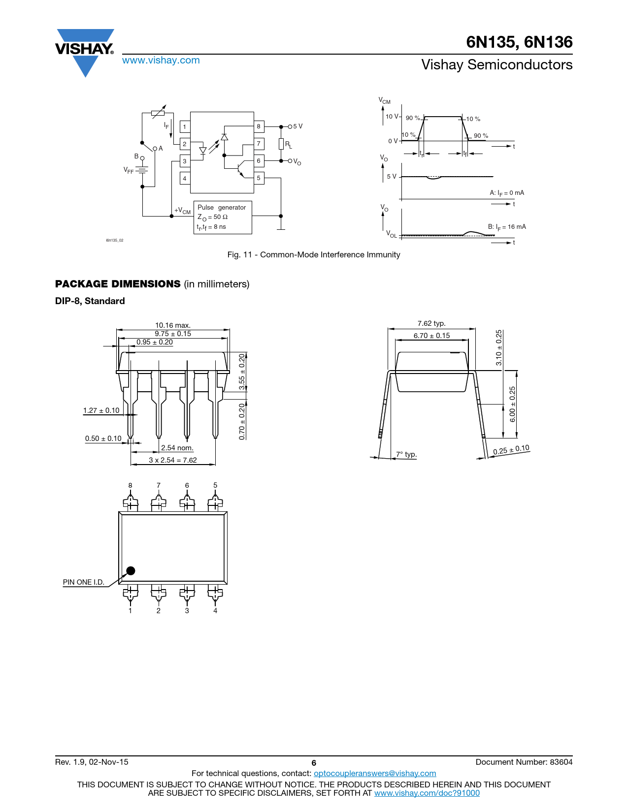 www.vishay.com Vishay Semiconductors VCM 10 V 90 % 10 % IF 1 8 5 V 10 % 90 % 0 V 2 7 RL t A t B V r tf O 3 6 VO VFF 5 V 4 5 A: IF = 0 mA t Pulse generator V +V O CM Z O = 50 Ω t B: I r,tf = 8 ns F = 16 mA VOL i6n135_02 t Fig. 11 - Common-Mode Interference Immunity