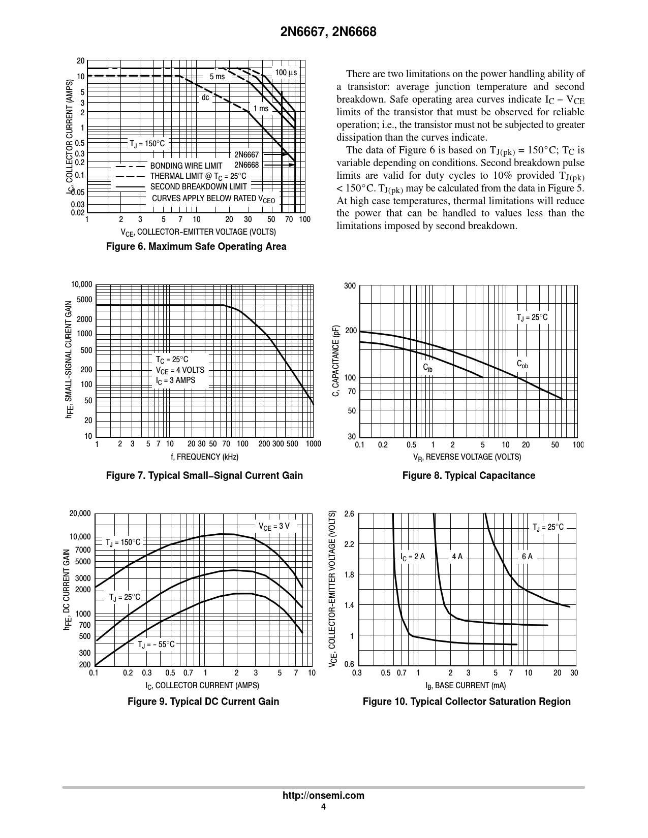 link to page 4 link to page 3 2N6667, 2N6668 20 100 μs 10 5 ms There are two limitations on the power handling ability of a transistor: average junction temperature and second 5 dc (AMPS) 3 breakdown. Safe operating area curves indicate IC − VCE 1 ms 2 limits of the transistor that must be observed for reliable 1 operation; i.e., the transistor must not be subjected to greater dissipation than the curves indicate. 0.5 TJ = 150°C OR CURRENT 0.3 The data of Figure 6 is based on T 2N6667 J(pk) = 150_C; TC is 0.2 BONDING WIRE LIMIT 2N6668 variable depending on conditions. Second breakdown pulse 0.1 THERMAL LIMIT @ TC = 25°C limits are valid for duty cycles to 10% provided TJ(pk) , COLLECT SECOND BREAKDOWN LIMIT I C < 150_C. T 0.05 J(pk) may be calculated from the data in Figure 5. CURVES APPLY BELOW RATED VCEO 0.03 At high case temperatures, thermal limitations will reduce 0.02 the power that can be handled to values less than the 1 2 3 5 7 10 20 30 50 70 100 limitations imposed by second breakdown. VCE, COLLECTOR-EMITTER VOLTAGE (VOLTS) Figure 6. Maximum Safe Operating Area 10,000 300 5000 GAIN 2000 TJ = 25°C 1000 200 CURENT 500 T ANCE (pF) C = 25°C C 200 ob V C CE = 4 VOLTS ACIT ib I 100 100 C = 3 AMPS C, CAP 70 , SMALL-SIGNAL 50 FE 50 h 20 10 30 1 2 3 5 7 10 20 30 50 70 100 200 300 500 1000 0.1 0.2 0.5 1 2 5 10 20 50 100 f, FREQUENCY (kHz) VR, REVERSE VOLTAGE (VOLTS) Figure 7. Typical Small−Signal Current GainFigure 8. Typical Capacitance 20,000 2.6 TS) VCE = 3 V TJ = 25°C 10,000 TJ = 150°C 2.2 7000 TAGE (VOL IC = 2 A 4 A 6 A GAIN 5000 3000 1.8 2000 TJ = 25°C 1.4 , DC CURRENT 1000 OR-EMITTER VOL FEh 700 500 1 TJ = - 55°C , COLLECT 300 CE 200 V 0.6 0.1 0.2 0.3 0.5 0.7 1 2 3 5 7 10 0.3 0.5 0.7 1 2 3 5 7 10 20 30 IC, COLLECTOR CURRENT (AMPS) IB, BASE CURRENT (mA) Figure 9. Typical DC Current GainFigure 10. Typical Collector Saturation Regionhttp://onsemi.com4