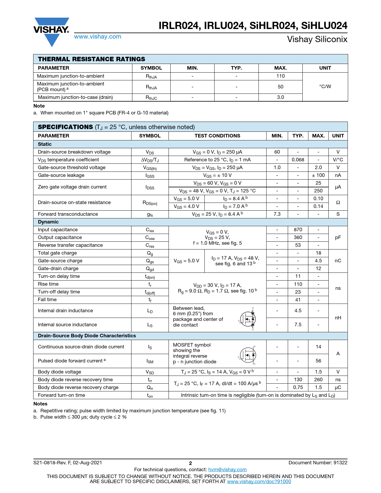 IRLR024, IRLU024, SiHLR024, SiHLU024 www.vishay.com Vishay Siliconix THERMAL RESISTANCE RATINGS PARAMETER SYMBOLMIN.TYP.MAX.UNIT Maximum junction-to-ambient RthJA - - 110 Maximum junction-to-ambient °C/W (PCB mount) a RthJA - - 50 Maximum junction-to-case (drain) RthJC - - 3.0 Note a. When mounted on 1" square PCB (FR-4 or G-10 material) SPECIFICATIONS (TJ = 25 °C, unless otherwise noted) PARAMETER SYMBOLTESTCONDITIONSMIN.TYP.MAX.UNITStatic Drain-source breakdown voltage VDS VGS = 0 V, ID = 250 μA 60 - - V VDS temperature coefficient ΔVDS/TJ Reference to 25 °C, ID = 1 mA - 0.068 - V/°C Gate-source threshold voltage VGS(th) VDS = VGS, ID = 250 μA 1.0 - 2.0 V Gate-source leakage IGSS VGS = ± 10 V - - ± 100 nA VDS = 60 V, VGS = 0 V - - 25 Zero gate voltage drain current IDSS μA VDS = 48 V, VGS = 0 V, TJ = 125 °C - - 250 VGS = 5.0 V ID = 8.4 A b - - 0.10 Drain-source on-state resistance RDS(on) Ω VGS = 4.0 V ID = 7.0 A b - - 0.14 Forward transconductance gfs VDS = 25 V, ID = 8.4 A b 7.3 - - S Dynamic Input capacitance Ciss V - 870 - GS = 0 V, Output capacitance Coss VDS = 25 V, - 360 - pF f = 1.0 MHz, see fig. 5 Reverse transfer capacitance Crss - 53 - Total gate charge Qg - - 18 I Gate-source charge Qgs V D = 17 A, VDS = 48 V, GS = 5.0 V - - 4.5 nC see fig. 6 and 13 b Gate-drain charge Qgd - - 12 Turn-on delay time td(on) - 11 - Rise time tr V - 110 - DD = 30 V, ID = 17 A, ns R Turn-off delay time t g = 9.0 Ω, RD = 1.7 Ω, see fig. 10 b d(off) - 23 - Fall time tf - 41 - Between lead, D Internal drain inductance LD - 4.5 - 6 mm (0.25") from package and center of nH G Internal source inductance LS die contact - 7.5 - S Drain-Source Body Diode Characteristics Continuous source-drain diode current I MOSFET symbol S D - - 14 showing the integral reverse A G Pulsed diode forward current a ISM p - n junction diode - - 56 S Body diode voltage VSD TJ = 25 °C, IS = 14 A, VGS = 0 V b - - 1.5 V Body diode reverse recovery time trr - 130 260 ns TJ = 25 °C, IF = 17 A, dI/dt = 100 A/μs b Body diode reverse recovery charge Qrr - 0.75 1.5 μC Forward turn-on time ton Intrinsic turn-on time is negligible (turn-on is dominated by LS and LD) Notes a. Repetitive rating; pulse width limited by maximum junction temperature (see fig. 11) b. Pulse width ≤ 300 μs; duty cycle ≤ 2 % S21-0818-Rev. F, 02-Aug-2021 2 Document Number: 91322 For technical questions, contact: hvm@vishay.com THIS DOCUMENT IS SUBJECT TO CHANGE WITHOUT NOTICE. THE PRODUCTS DESCRIBED HEREIN AND THIS DOCUMENT ARE SUBJECT TO SPECIFIC DISCLAIMERS, SET FORTH AT www.vishay.com/doc?91000