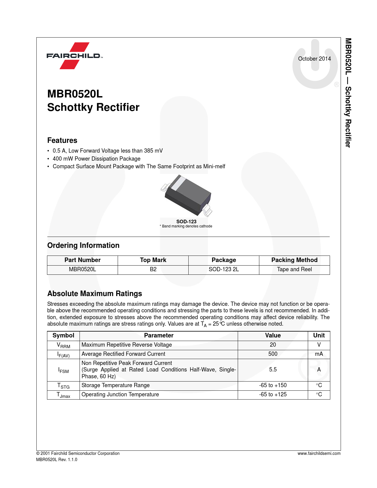 MBR0520L Rev. 1.1.0 www.fairchildsemi.com MBR0520L — Schottky Rectifier October 2014