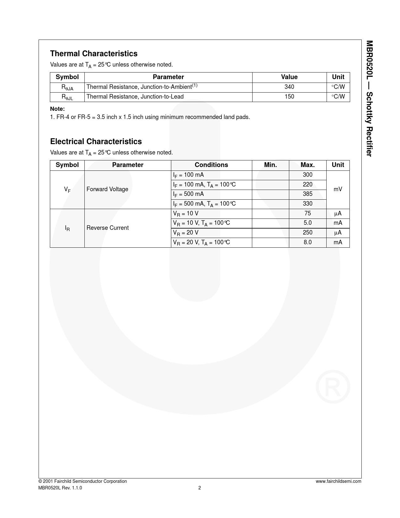 MBR0520L Rev. 1.1.0 Conditions Min. Max. IF = 100 mA 300 Unit IF = 100 mA, TA = 100°C 220 IF = 500 mA 385 IF = 500 mA, TA = 100°C 330 VR = 10 V 75 μA mV VR = 10 V, TA = 100°C 5.0 mA VR = 20 V 250 μA VR = 20 V, TA = 100°C 8.0 mA www.fairchildsemi.com