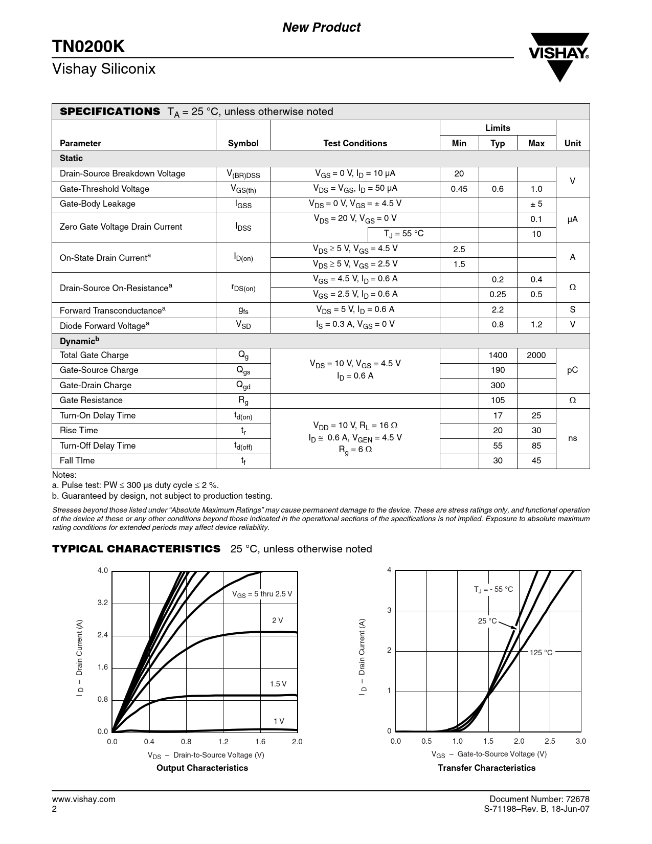 New ProductTN0200K Vishay Siliconix SPECIFICATIONS TA = 25 °C, unless otherwise noted LimitsParameter SymbolTestConditionsMin TypMaxUnitStatic Drain-Source Breakdown Voltage V(BR)DSS VGS = 0 V, ID = 10 µA 20 V Gate-Threshold Voltage VGS(th) VDS = VGS, ID = 50 µA 0.45 0.6 1.0 Gate-Body Leakage IGSS VDS = 0 V, VGS = ± 4.5 V ± 5 VDS = 20 V, VGS = 0 V 0.1 µA Zero Gate Voltage Drain Current IDSS TJ = 55 °C 10 V ≥ DS 5 V, VGS = 4.5 V 2.5 On-State Drain Currenta ID(on) A V ≥ DS 5 V, VGS = 2.5 V 1.5 VGS = 4.5 V, ID = 0.6 A 0.2 0.4 Drain-Source On-Resistancea rDS(on) Ω VGS = 2.5 V, ID = 0.6 A 0.25 0.5 Forward Transconductancea gfs VDS = 5 V, ID = 0.6 A 2.2 S Diode Forward Voltagea VSD IS = 0.3 A, VGS = 0 V 0.8 1.2 V Dynamicb Total Gate Charge Qg 1400 2000 VDS = 10 V, VGS = 4.5 V Gate-Source Charge Qgs 190 pC ID = 0.6 A Gate-Drain Charge Qgd 300 Gate Resistance Rg 105 Ω Turn-On Delay Time td(on) 17 25 VDD = 10 V, RL = 16 Ω Rise Time tr 20 30 ID ≅ 0.6 A, VGEN = 4.5 V ns Turn-Off Delay Time td(off) R 55 85 g = 6 Ω Fall TIme tf 30 45 Notes: a. Pulse test: PW ≤ 300 µs duty cycle ≤ 2 %. b. Guaranteed by design, not subject to production testing. Stresses beyond those listed under “Absolute Maximum Ratings” may cause permanent damage to the device. These are stress ratings only, and functional operation of the device at these or any other conditions beyond those indicated in the operational sections of the specifications is not implied. Exposure to absolute maximum rating conditions for extended periods may affect device reliability. TYPICAL CHARACTERISTICS 25 °C, unless otherwise noted 4.0 4 T V J = - 55 °C GS = 5 thru 2.5 V 3.2 3 2 V 25 °C 2.4 2 125 °C ain Current (A) 1.6 ain Current (A) – Dr 1.5 V – Dr D D I 1 I 0.8 1 V 0.0 0 0.0 0.4 0.8 1.2 1.6 2.0 0.0 0.5 1.0 1.5 2.0 2.5 3.0 VDS – Drain-to-Source Voltage (V) VGS – Gate-to-Source Voltage (V) Output CharacteristicsTransfer Characteristics www.vishay.com Document Number: 72678 2 S-71198–Rev. B, 18-Jun-07 Document Outline Datasheet Disclaimer