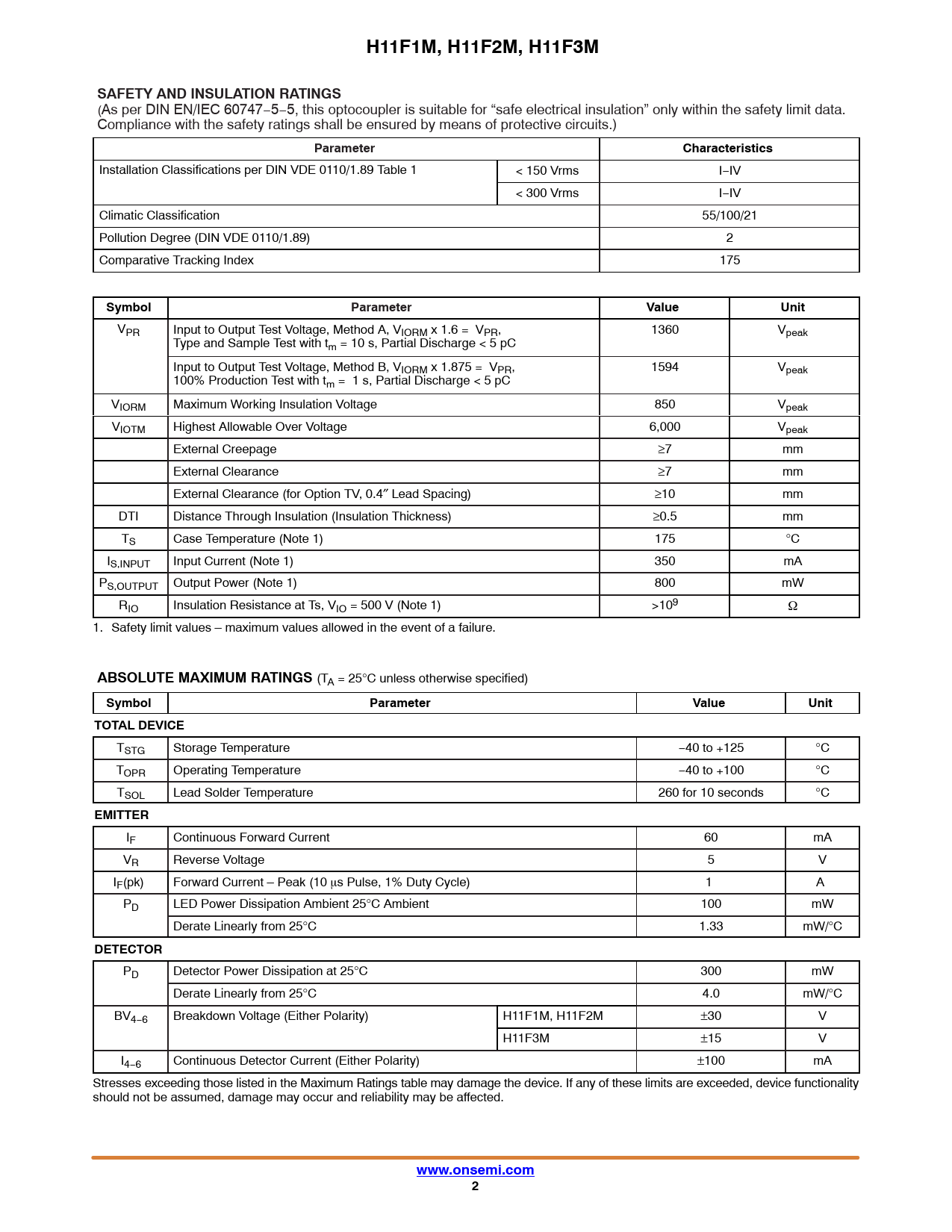 H11F1M, H11F2M, H11F3M. SAFETY AND INSULATION RATINGS. Parameter. Characteristics. Symbol. Value. Unit. ABSOLUTE MAXIMUM RATINGS