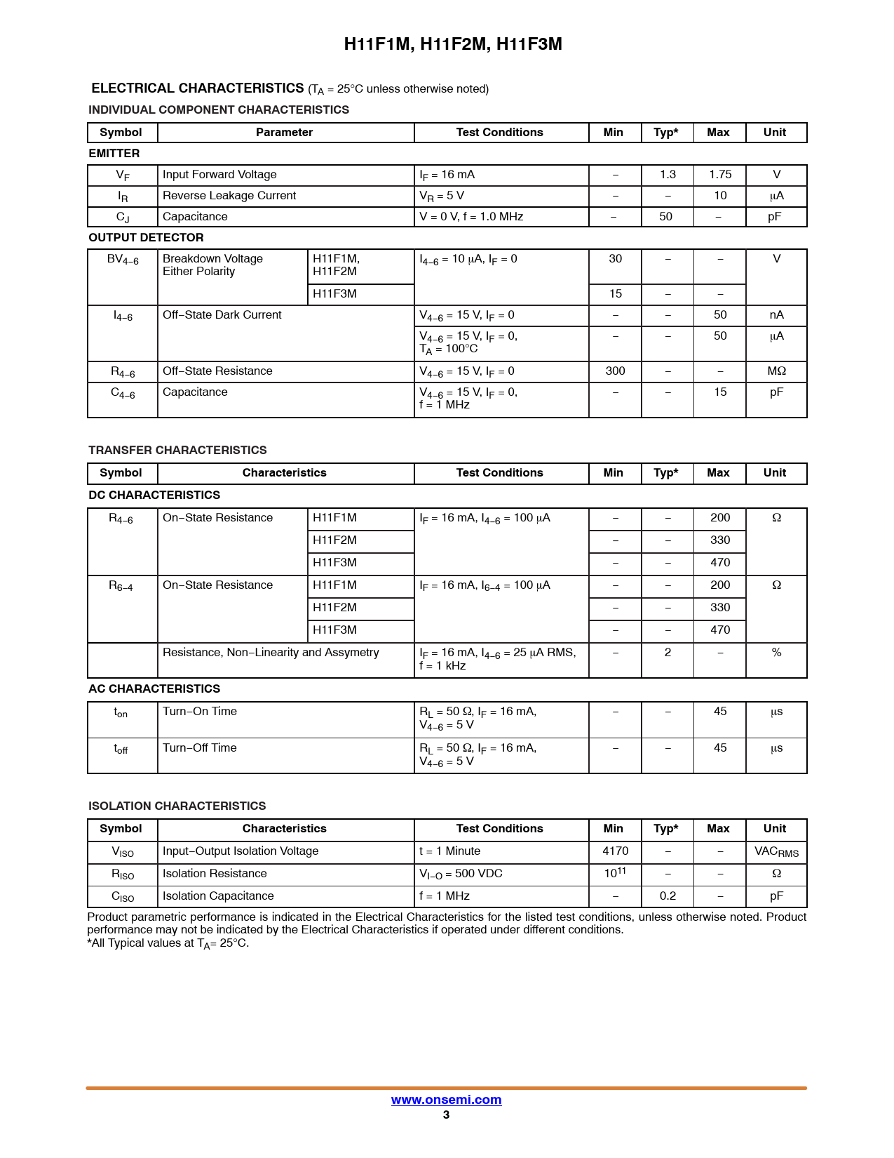 H11F1M, H11F2M, H11F3MELECTRICAL CHARACTERISTICS (TA = 25°C unless otherwise noted) INDIVIDUAL COMPONENT CHARACTERISTICSSymbolParameterTest ConditionsMinTyp*MaxUnitEMITTER VF Input Forward Voltage IF = 16 mA − 1.3 1.75 V IR Reverse Leakage Current VR = 5 V − − 10 mA CJ Capacitance V = 0 V, f = 1.0 MHz − 50 − pF OUTPUT DETECTOR BV4−6 Breakdown Voltage H11F1M, I4−6 = 10 mA, IF = 0 30 − − V Either Polarity H11F2M H11F3M 15 − − I4−6 Off−State Dark Current V4−6 = 15 V, IF = 0 − − 50 nA V4−6 = 15 V, IF = 0, − − 50 mA TA = 100°C R4−6 Off−State Resistance V4−6 = 15 V, IF = 0 300 − − MW C4−6 Capacitance V4−6 = 15 V, IF = 0, − − 15 pF f = 1 MHz TRANSFER CHARACTERISTICSSymbolCharacteristicsTest ConditionsMinTyp*MaxUnitDC CHARACTERISTICS R4−6 On−State Resistance H11F1M IF = 16 mA, I4−6 = 100 mA − − 200 W H11F2M − − 330 H11F3M − − 470 R6−4 On−State Resistance H11F1M IF = 16 mA, I6−4 = 100 mA − − 200 W H11F2M − − 330 H11F3M − − 470 Resistance, Non−Linearity and Assymetry IF = 16 mA, I4−6 = 25 mA RMS, − 2 − % f = 1 kHz AC CHARACTERISTICS ton Turn−On Time RL = 50 W, IF = 16 mA, − − 45 ms V4−6 = 5 V toff Turn−Off Time RL = 50 W, IF = 16 mA, − − 45 ms V4−6 = 5 V ISOLATION CHARACTERISTICSSymbolCharacteristicsTest ConditionsMinTyp*MaxUnit VISO Input−Output Isolation Voltage t = 1 Minute 4170 − − VACRMS RISO Isolation Resistance VI−O = 500 VDC 1011 − − W CISO Isolation Capacitance f = 1 MHz − 0.2 − pF Product parametric performance is indicated in the Electrical Characteristics for the listed test conditions, unless otherwise noted. Product performance may not be indicated by the Electrical Characteristics if operated under different conditions. *All Typical values at TA= 25°C. www.onsemi.com3